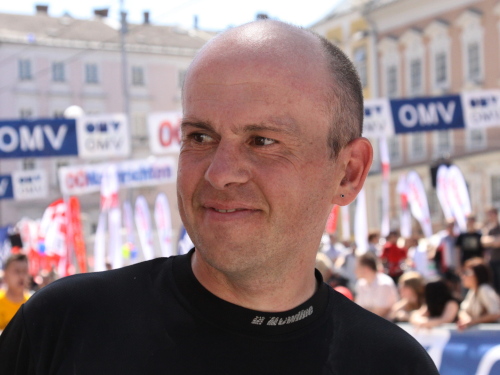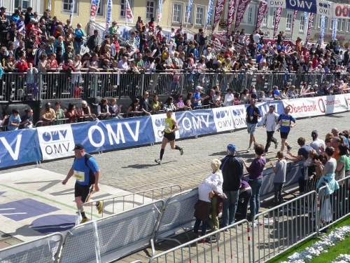 Kilometer 41: Wieder biegen wir ein in die lange Zielgerade auf der Landstraße. Noch einmal lassen wir uns von der anhaltend fantastischen Stimmung tragen, die zunimmt, je näher das Ziel rückt. Der letzte Kilometer wird dem Läufer in Linz leicht gemacht. Man wird förmlich ins Ziel getragen. Selten habe ich bei einem Marathon einen dermaßen emotionsgeladenen Schlusskilometer erlebt. Wie oft habe ich das Ende des letzten Marathonkilometers herbei gesehnt. Hier nicht. Fast schon bedauere ich, als sich auf einmal der Linzer Hauptplatz vor mir öffnet. Pastelfarbene Barock- und Rokokofassaden säumen den repräsentativen, langgezogenen Platz, in seinem Zentrum überragt durch die riesige Dreifaltigkeitssäule. Zum Marathonfinale sind hohe Tribünen für die Zuschauer beidseits des Zieleinlaufs errichtet worden, zudem eine große Bühne mit public viewing-Leinwand, diverse Zelte. Tausende bevölkern den Platz und feiern die Ankömmlinge. Was für eine Szenerie! Ich fliege ins Ziel ....