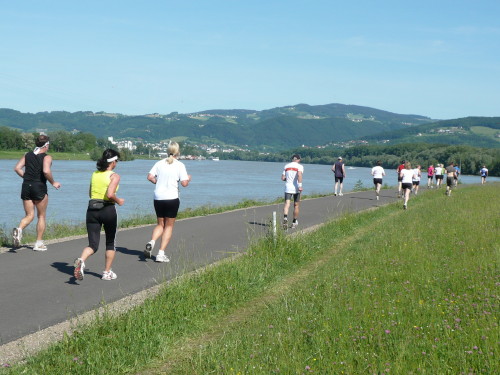 Auch an entlegenen Stellen postieren sich Fans und unterstützen die Läufer. Ich bin beeindruckt. Und überrascht. Linz ist eine Industriestadt und hat bestimmt seine nicht ganz so attraktiven Seiten, aber viele Grünzonen. Zum Beispiel den Wasserwald, ein Paradies für Jogger und Walker. „Am langen Zaun“ heißt die schmale Siedlungsstraße mit den schmucken Einfamilienhäuschen hier. „Hast du Durst, hast du Hunger?“, werde ich gefragt und eine Frau rennt so lange neben mir her, bis ich ihr die Wasserflasche abnehme.