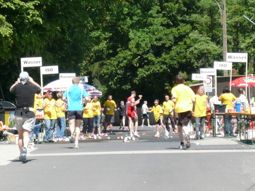 Judith und ich werden oft überholt, meist von Staffelläufern mit gelben Gürteln, an denen die Nummern mit dem Staffelchip angebracht sind. Viele Anwohner nutzen die Chance für einen Frühschoppen an der Strecke. "S'gmiadliche Eck" hat Tische an den Laufweg gerückt. Für uns gibt es eine Verpflegungsstelle. Zurück im Park kommen wir an einer extra ausgewiesenen Ruhezone vorbei. Gleich dahinter dröhnt es mit erheblicher Phonzahl aus Lautsprechern. Der Veranstalter hat an einigen ruhigeren Bereichen Musikbeschallung organisiert. Echt super, mein Lauftempo erhöht sich.
