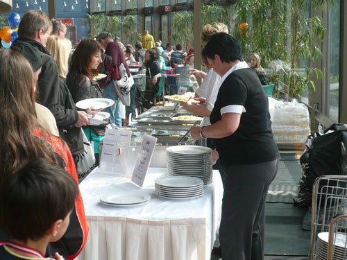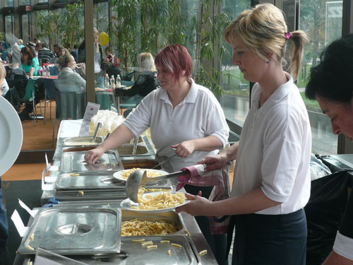 Trotz der vielen Bewerbe und der erwarteten 15.000 Teilnehmer gibt es beim Empfang unserer Startnummern im Untergeschoß keine lange Wartezeiten, jeder Lauf hat seinen eigenen großen Abholbereich. Anschließend geht’s zur Pastaparty ein Stockwerk höher, die hat mir Klaus ausdrücklich nahe gelegt. Im Paket inbegriffen ist sie nicht, aber über 5 Euro einschließlich Getränk kann man nicht meckern. Zu den wohlschmeckenden Nudeln kann man Carbonara, Tomaten-, Fleisch- oder Käsesauce wählen. Dazu gibt es gratis einen First-Class-Ausblick auf die geruhsam dahin fließende Donau.