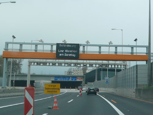 Bei Ankunft in Linz wird schon auf der Stadtautobahn auf einem großen Leuchtschild darauf hingewiesen, hier gibt’s morgen Behinderungen. Verursacher werden wir sein. Einmalig auf der Welt denke ich, ist die Sperrung einer Autobahn für einen Marathon. Hier in Österreich ist das idealerweise möglich, versuche mal einer so was in Deutschland, kaum auszudenken.