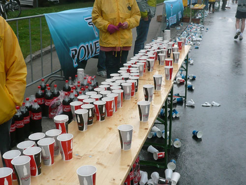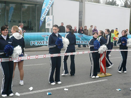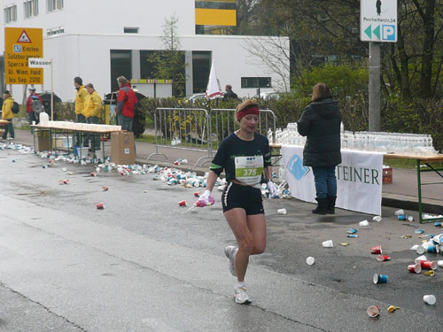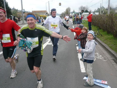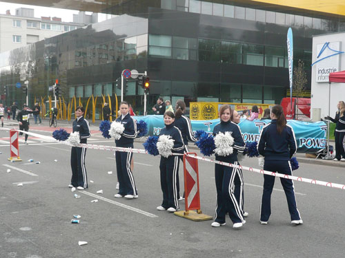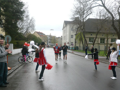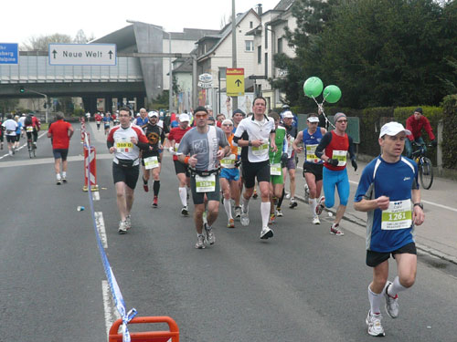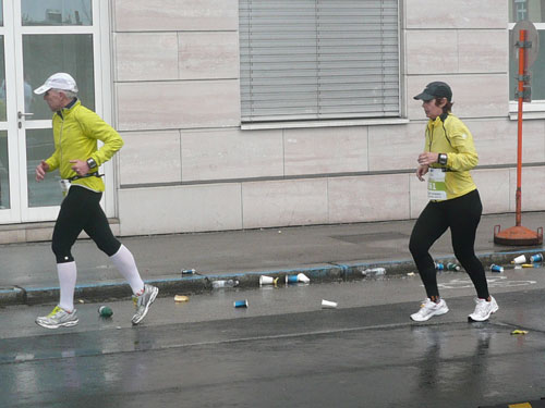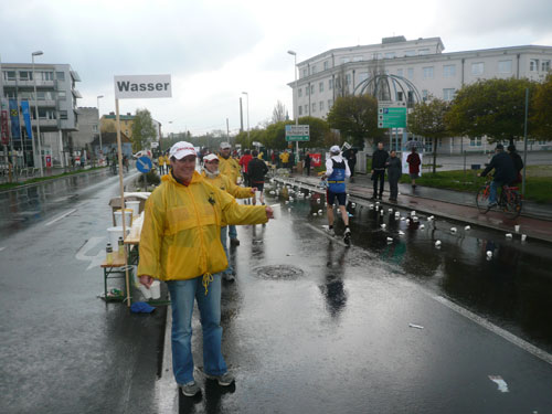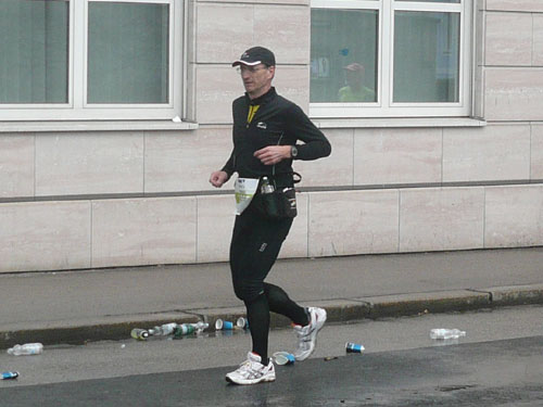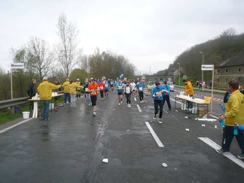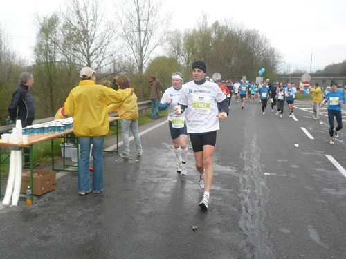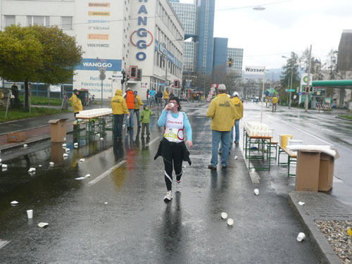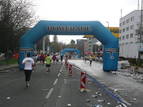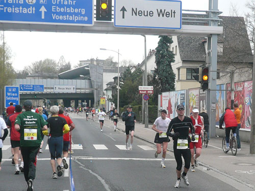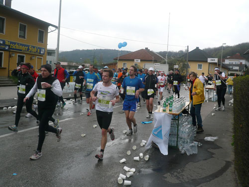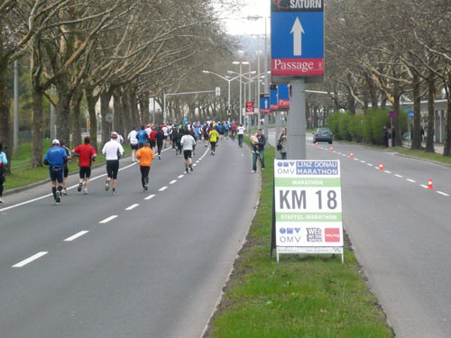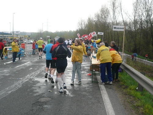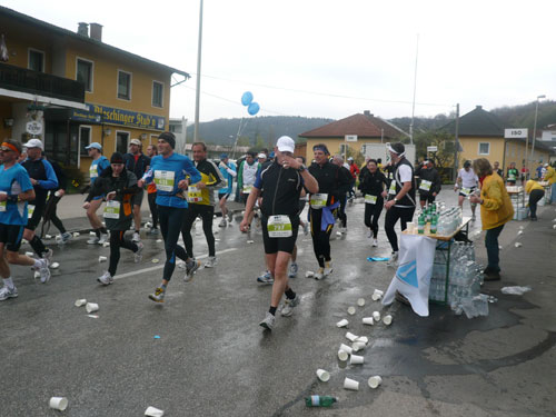 „Gottes Segen ist mit euch, kommt gut ins Ziel“ wünscht allen Vorbeilaufenden ein überaus freundlicher Pfarrer vor der Pfarrkirche Don Bosco bei km 25. Ein paar Meter weiter stößt zur Gruppe in der ich mich gerade befinde ein Fahrradbegleiter, eine ganze Batterie Red Bull hat er für seine Bekannten dabei. Toller Service muss ich sagen, leider fällt nichts für mich ab. Aber zwei Kilometer weiter komme ich auch zu meinem Energieschub, an der Labestation bei km 27 wird – zum ersten Mal – Cola ausgeschenkt. Über unzureichende Verpflegung wird sich eh keiner beschweren können, alle Stationen sind sehr gut und ausreichend bestückt. Damit alle Teilnehmer gut hydriert und bei Kräften bleiben, werden entlang der Strecke rund 20.000 Liter Wasser, 9.000 Liter Elektrolytgetränke und 4.000 Liter Cola ausgeschenkt. Zudem steht feste Nahrung in Form von 3,5 Tonnen Bananen bereit.