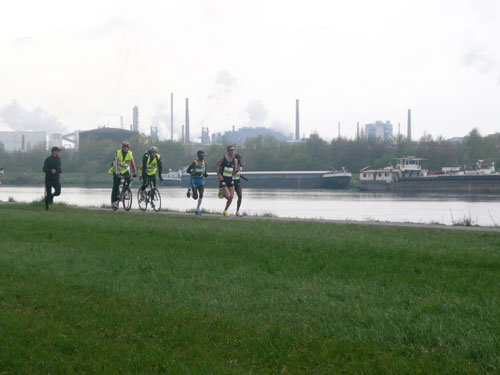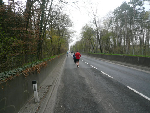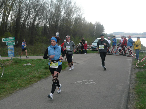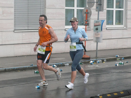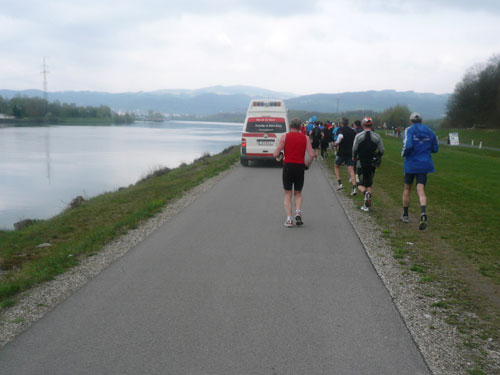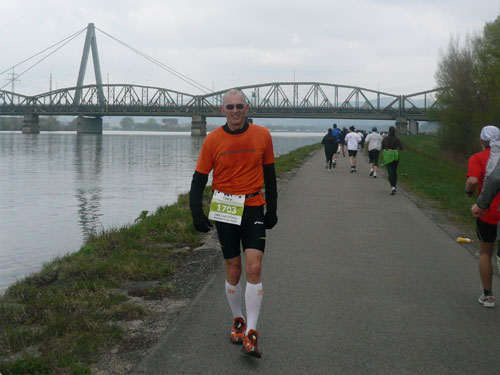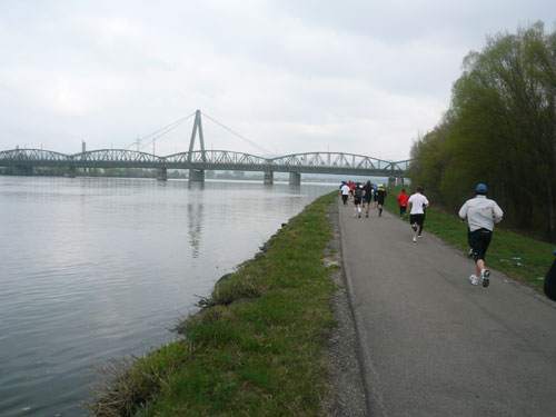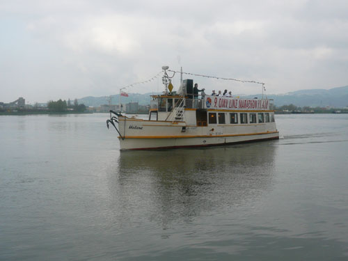Nach 9,5 km geht’s auch für uns nach einer Spitzkehre runter an die Donau und in entgegen gesetzter Richtung wieder zurück. Mehrere Kilometer laufen wir an der schönen „grauen“ Donau entlang. Leider ist sie heute nicht blau wie im Lied besungen, sondern hat sich dem grauen Himmel angepasst. Aber trotzdem ist der Abschnitt ein absolutes Highlight der Strecke, mir gefällt’s hier ausgezeichnet. In Ufernähe kommt uns die Helene, ein kleines Ausflugsboot entgegen. Musik und gut gelaunten Mädels sorgen darauf für Stimmung.