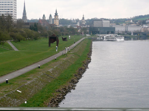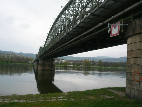 Ein weiterer, diesmal architektonischer Höhepunkt ist ein grüner Stahlkoloss. 1497 wurde Urfahr erstmals von Maximilian I. gestattet, sich mittels Brücke mit Linz zu verbinden. Die älteste heute noch bestehende Brücke ist die so genannte Eisenbahnbrücke, am 14. November 1900 wurde sie eröffnet, dient heute allerdings hauptsächlich als Straßenverkehrsbrücke und wird nur noch gelegentlich von Zügen befahren. Ein wahrhaft prächtiges Exemplar, ich postiere mich hier um mehrere Fotos zu schießen. Da kommt Jan angerauscht und erzählt mir von seinem Startabenteuer und der leeren Autobahn.