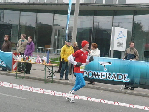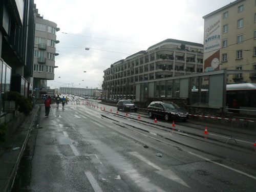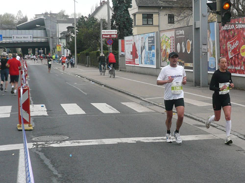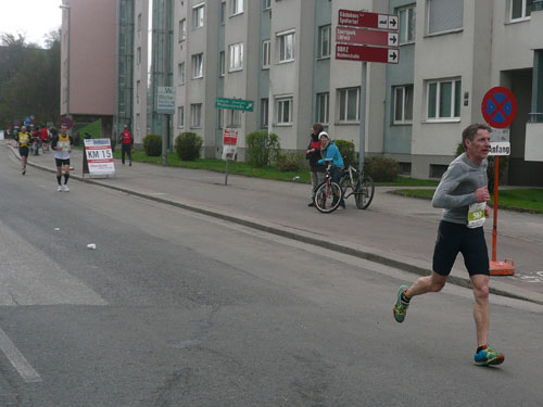 Nach 15 km sind wir zurück im Stadtgebiet von Urfahr, diesmal unterqueren wir die Autobahnbrücke der Mühlkreis-Autobahn. 1919 wurde Urfahr von Linz eingemeindet. Der Name entwickelte sich aus dem Wort Überfahrt, die nötig war, um von Linz hierher zu gelangen. Plötzlich sind die Straßen nass, aber wir sind noch trocken, da hat’s wohl vor uns die Schnelleren mit einem Schauer schon kalt erwischt. Unser weiterer Weg führt Richtung Nibelungenbrücke, das 1938 errichtete Bauwerk befindet sich an einer Stelle, an der bereits um 1501 die erste und lange Zeit einzige Linzer Brücke errichtet wurde, die wir aber nicht überqueren, da wir nach links geleitet werden. Wenige Meter später ist die Halbmarathonmarke erreicht, ich bin mit 1:59 und vielen geschossenen Bildern gut in der Zeit, das passt.
