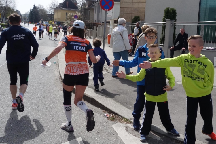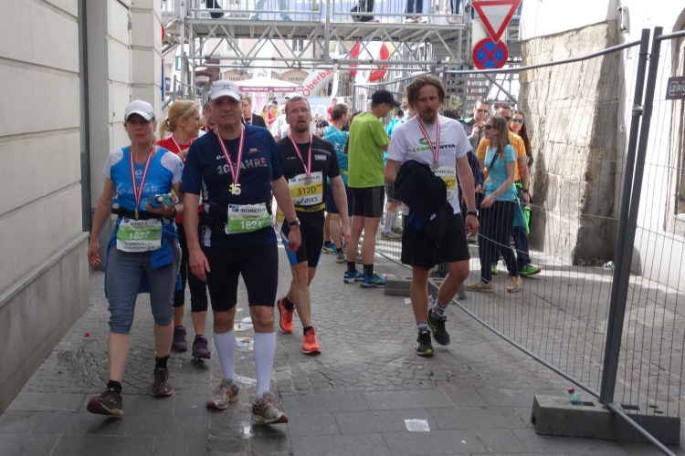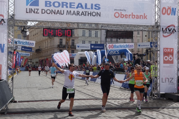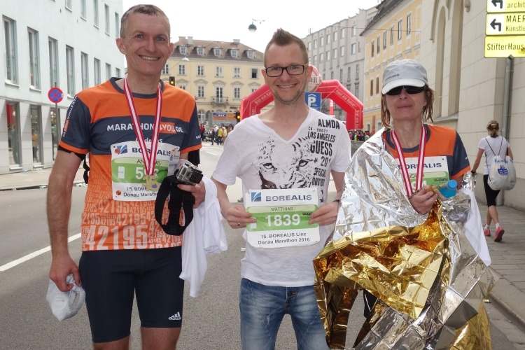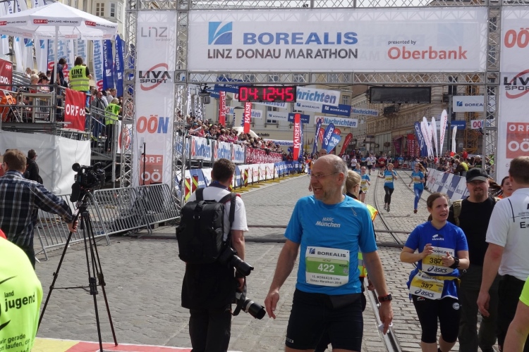 Wir treffen Matthias aus Deutschland, der seit zehn Jahren in Wien lebt und mit dem wir uns vor dem Start unterhalten haben. Er wurde in persönlicher Bestzeit von 2:46:11 Vierzehnter der Gesamtwertung. So kennen wir nun nicht nur viele Läufer, die Hunderte von Marathons in den Beinen haben (auch Österreich-Rekordler Gerhard Wally war wieder dabei, ebenso M4Y-Marathonsammler Anton Reiter), sondern auch einen sympathischen Sportler, der zwar weniger Wettkämpfe absolviert, aber dafür um einiges schneller ist als wir.