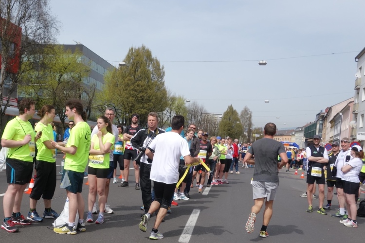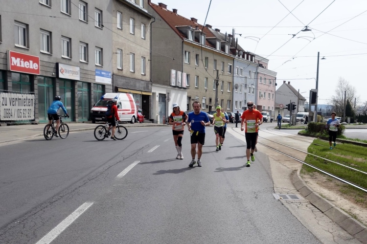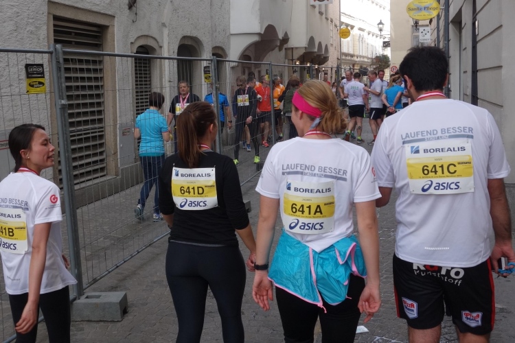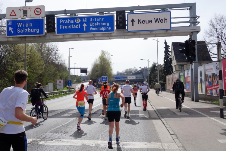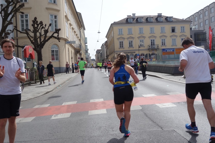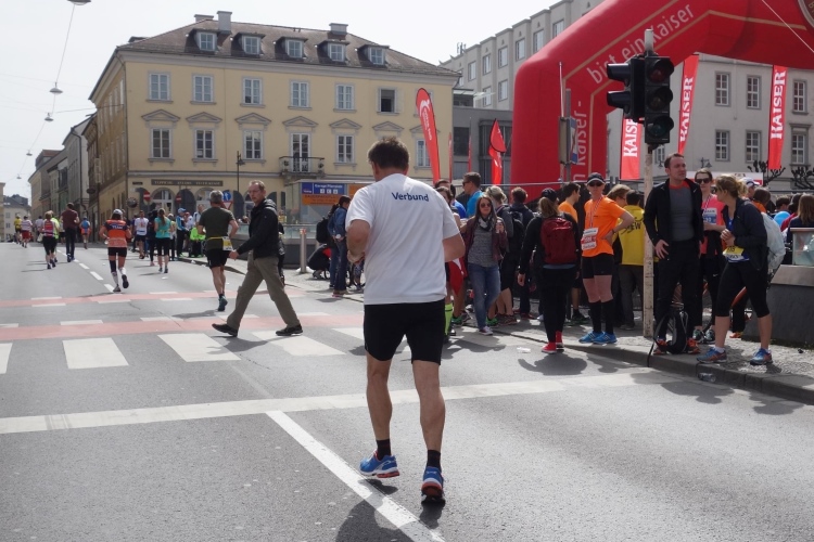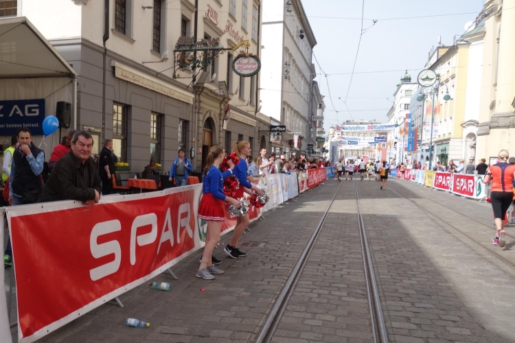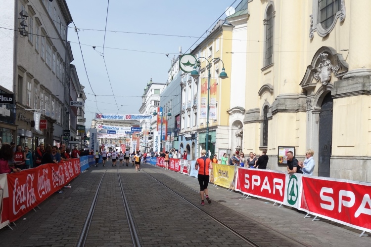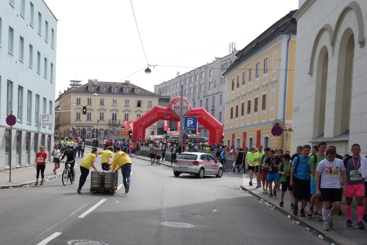 Wieder auf der Landstraße, der letzte Kilometer steht bevor. Auf den Freischankflächen der Restaurants wird das Mittagessen eingenommen. Sightseeing ist angesagt: Palais Kaufmännischer Verein, Karmelitenirche, Ursulinenkiche, Stieglbräu Klosterhof, Jesuitenkirche und viele Einkaufspassagen warten darauf, nach dem Marathon erkundet zu werden. Wir rennen mit den Staffeln, die nun zu viert ins Ziel unterwegs sind, um die Wette.