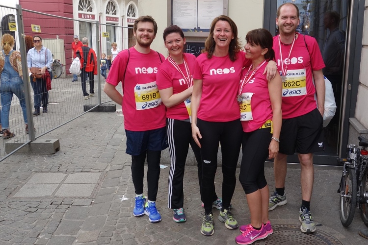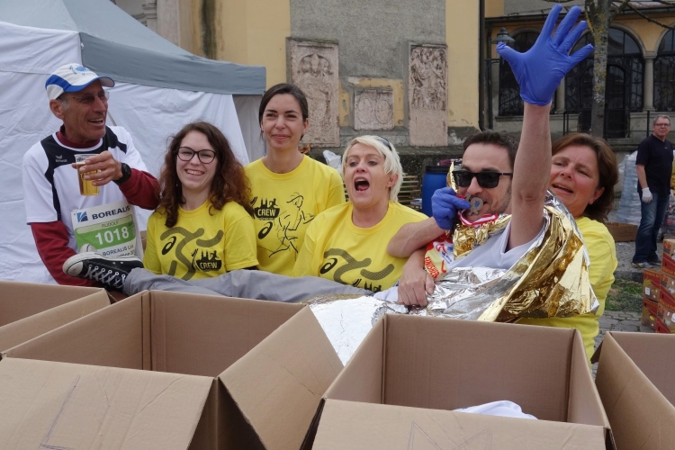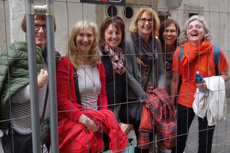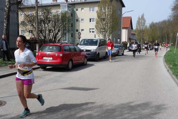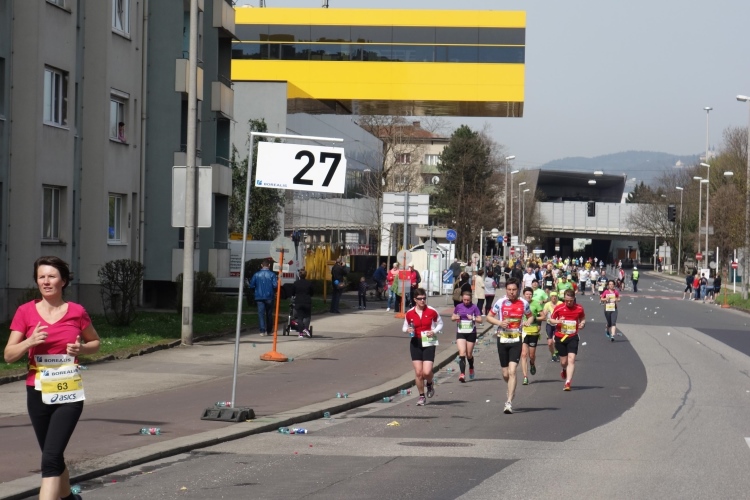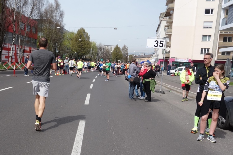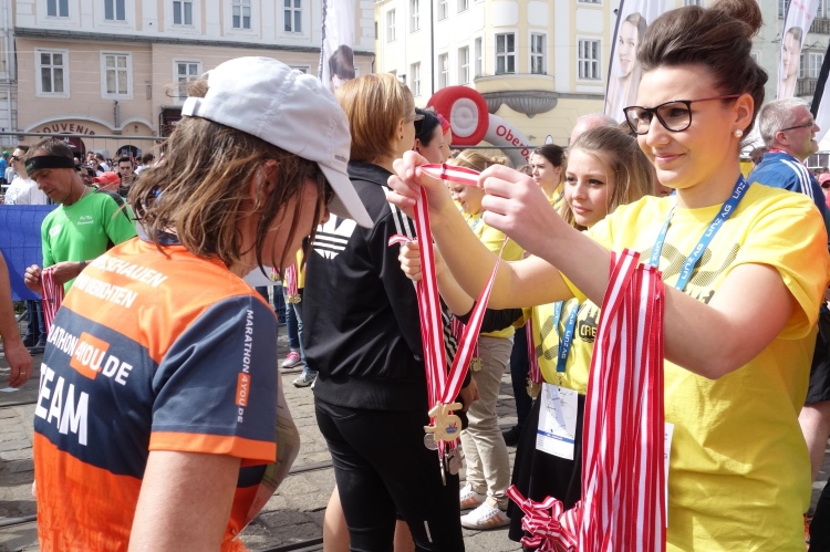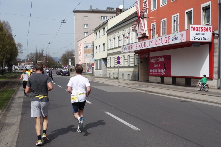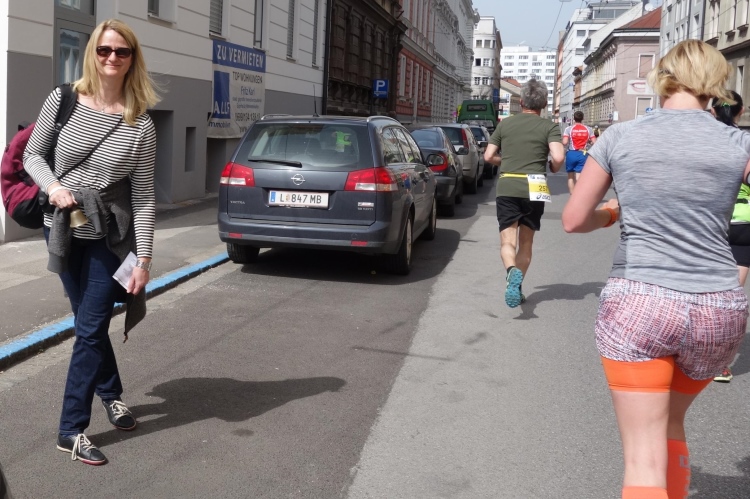 Wieder auf der Landstraße, der letzte Kilometer steht bevor. Auf den Freischankflächen der Restaurants wird das Mittagessen eingenommen. Sightseeing ist angesagt: Palais Kaufmännischer Verein, Karmelitenirche, Ursulinenkiche, Stieglbräu Klosterhof, Jesuitenkirche und viele Einkaufspassagen warten darauf, nach dem Marathon erkundet zu werden. Wir rennen mit den Staffeln, die nun zu viert ins Ziel unterwegs sind, um die Wette.