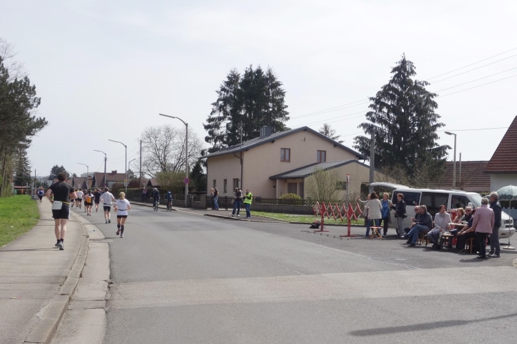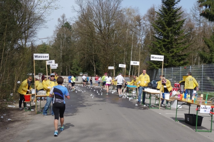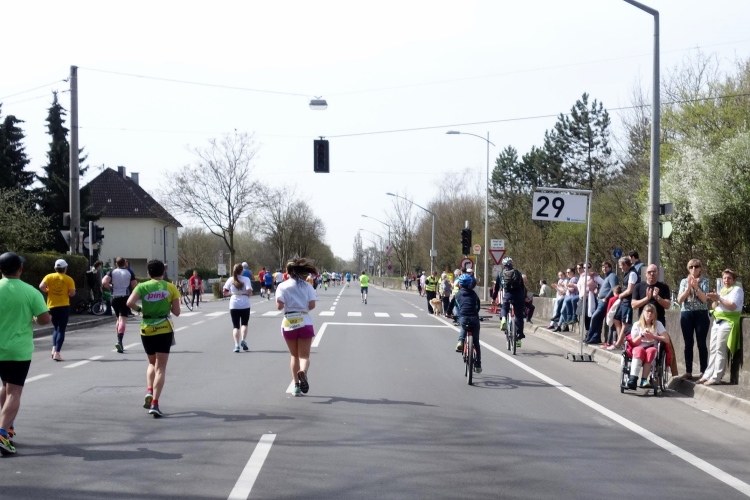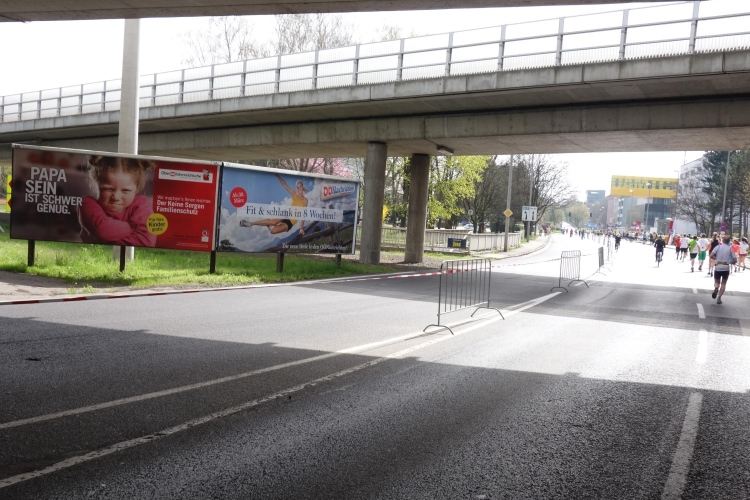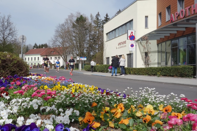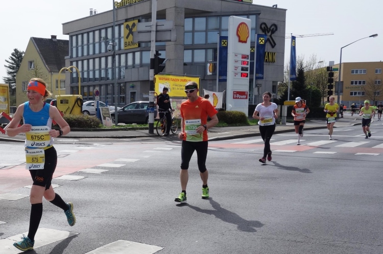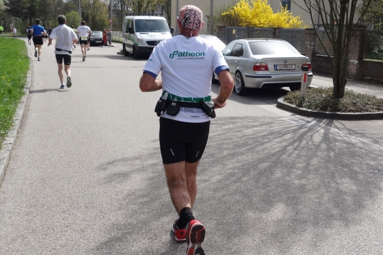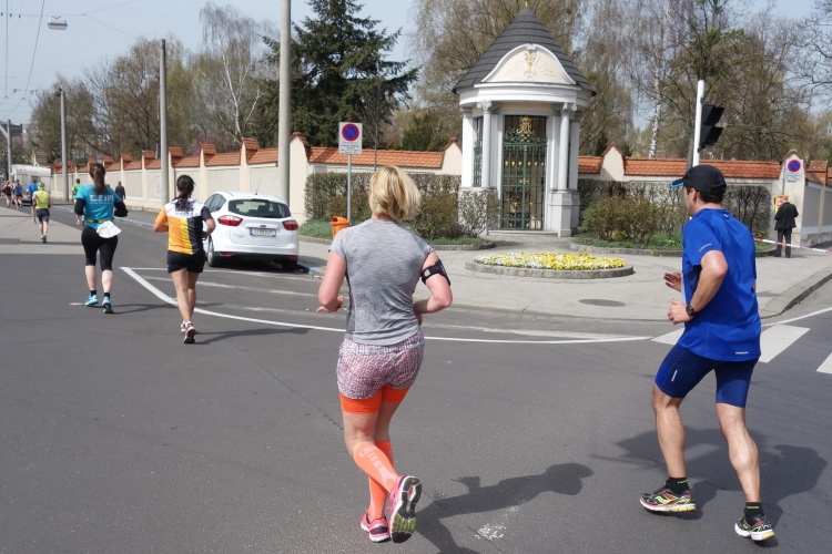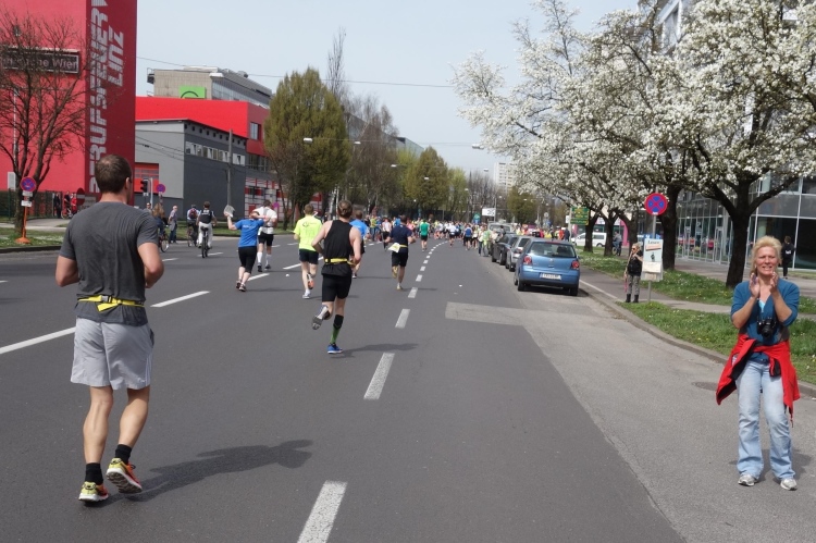 Die Wiener Straße liegt schön in der Sonne. Viele Kneipen gibt es hier und auch eine der Verpflegungsstationen: Wasser in Bechern oder in der 0,5 Liter-Römerquellen-Flasche, die ich aufgrund ihrer idealen Griffmulde gerne zum Training mitnehme. Dazu ISO in vielen Farben, Bananen und vor dem Ziel auch Cola. Alles schön mit Abstand, sodass kein Gedränge aufkommen muss. Die obligtorischen Toilettenhäuschen sind auch vorhanden. Soweit ich das mitbekommen habe, in den Innenstadtstraßen sogar recht häufig.