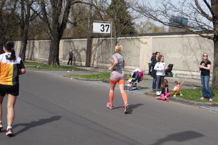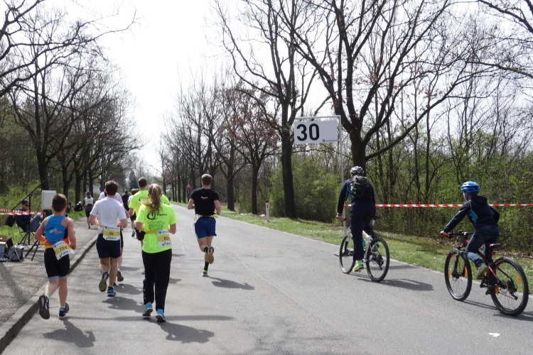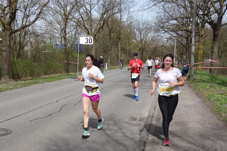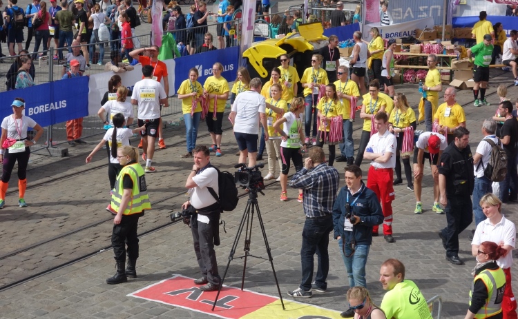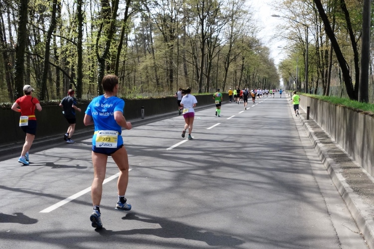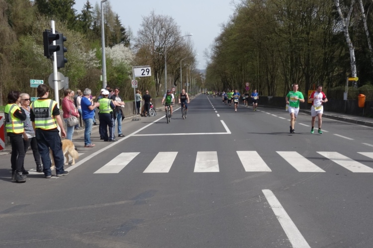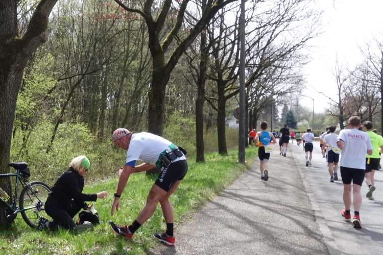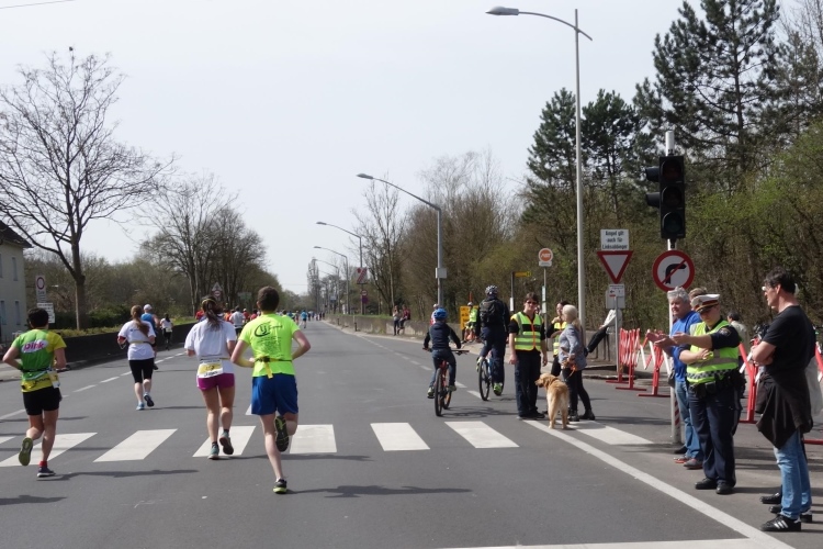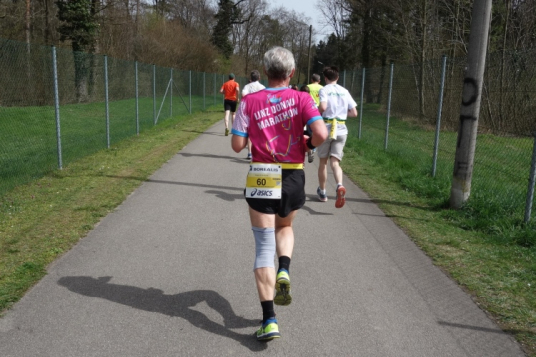 Die Wiener Straße liegt schön in der Sonne. Viele Kneipen gibt es hier und auch eine der Verpflegungsstationen: Wasser in Bechern oder in der 0,5 Liter-Römerquellen-Flasche, die ich aufgrund ihrer idealen Griffmulde gerne zum Training mitnehme. Dazu ISO in vielen Farben, Bananen und vor dem Ziel auch Cola. Alles schön mit Abstand, sodass kein Gedränge aufkommen muss. Die obligtorischen Toilettenhäuschen sind auch vorhanden. Soweit ich das mitbekommen habe, in den Innenstadtstraßen sogar recht häufig.