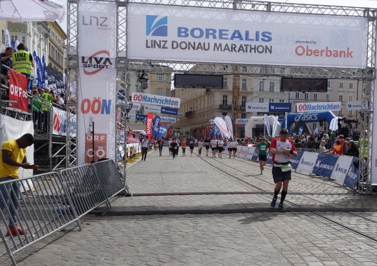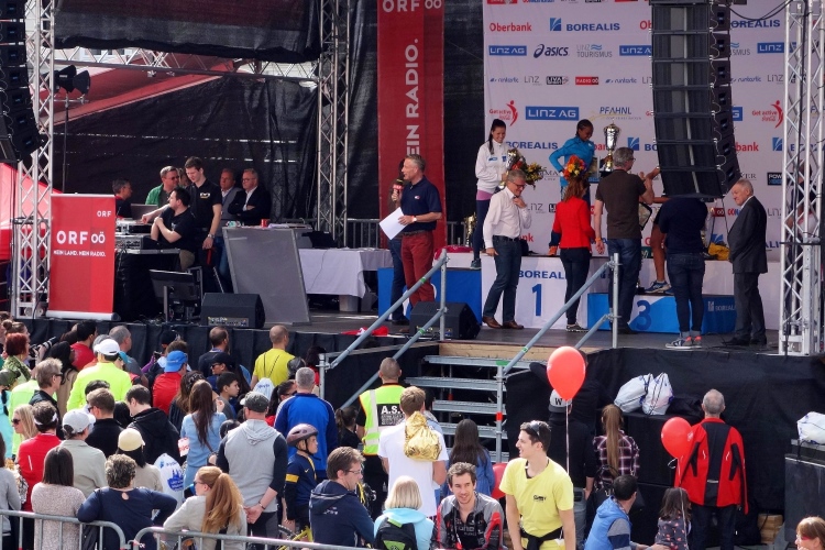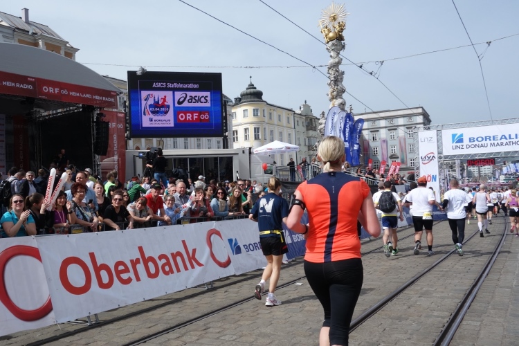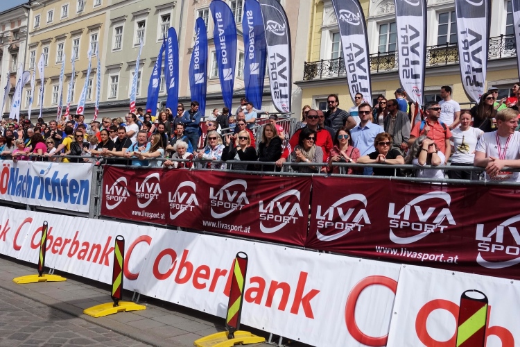 Der Linzer Hauptplatz mit der Dreifaltigkeitssäule, einer Pestsäule aus dem 18. Jahrhundert, liegt vor uns. Er zählt zu den schönsten Saalplätzen Österreichs. Heute ist er allerdings etwas verfremdet durch die große Zuschauertribüne gegenüber der nicht minder umfangreichen ORF-Bühne. Das ist ein Zieleinlauf, wie man ihn sich wünscht. Die Ränge sind noch gut besetzt, denn die Siegerehrungen stehen kurz bevor.