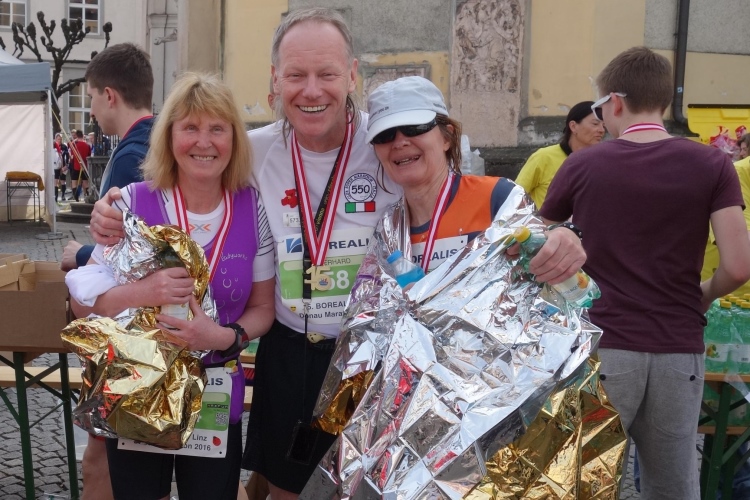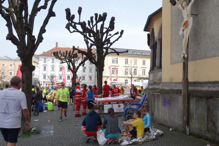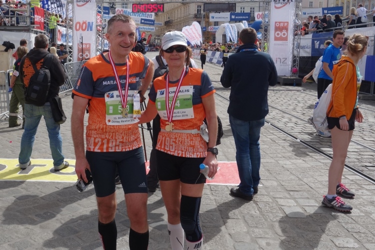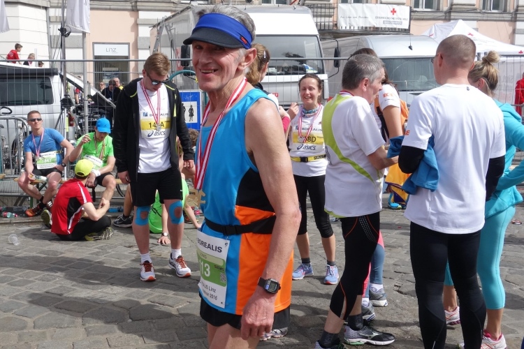Auch wir haben es nun geschafft. Wieder ist ein schöner Marathon zu Ende. Die goldene Medaille zeigt eine 15 anlässlich der 15. Austragung mit erstmals über 20.000 Gesamtteilnehmern. Einige Meter sind es zum Platz an der Stadtpfarrkirche. Die Organisation hat hier perfekt die Wege für Läufer und Zuschauer/Fußgänger getrennt. Auf dem Pfarrplatz gibt es für die Inhaber der grünen Startnummern, also die Marathonis, ein Finisher-Funktionshemd. Nochmals die guten Weckerl und fanastische Nuss- und Mohnschnecken und Getränke in allen Variationen. Ich spüle mit Leichtigkeit einen Liter Cola hinunter. Nur das Bier ist gerade aus. Als wir auf dem kurzen Weg zum Brucknerhaus sind, rollt eine Fuhre mit Nachschub an.