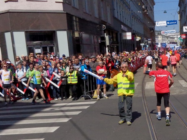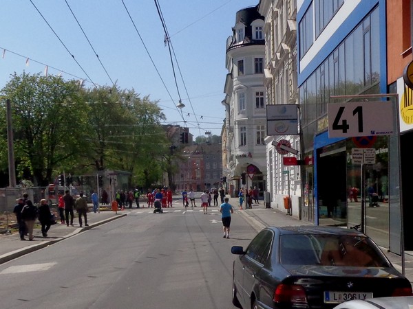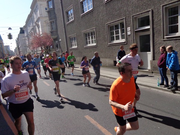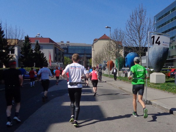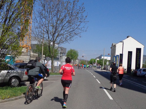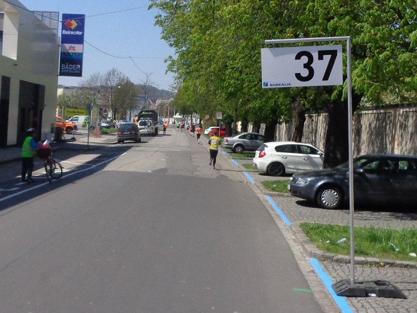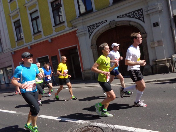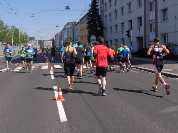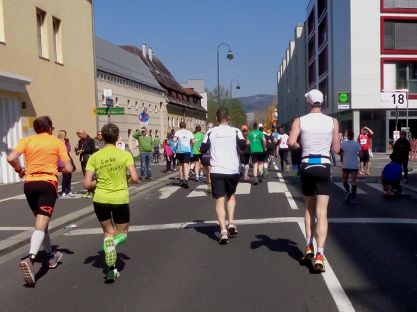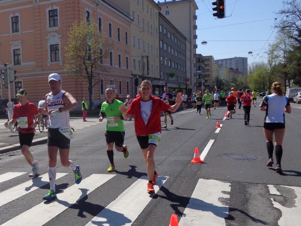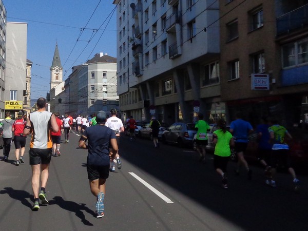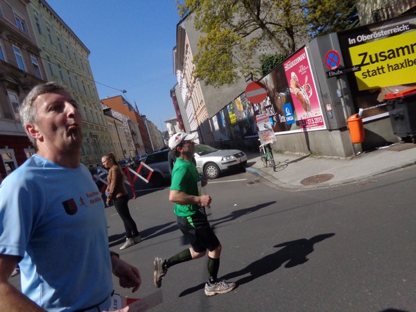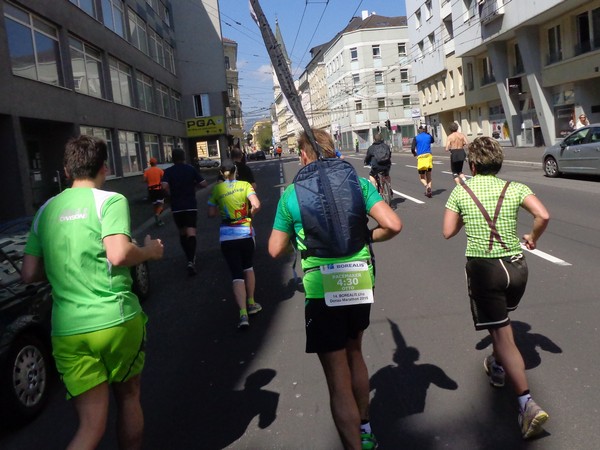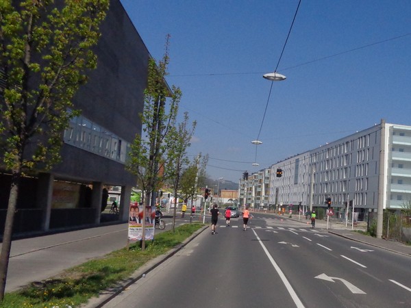Von der Wiener Straße geht es rechts in die Unionstraße, Gegenverkehrsbereich. Susanne kommt mir entgegen, die bisher einzige Österreicherin mit über 100 Marathons. Netto, wie sich Dirk auszudrücken pflegt. Das heißt: zusätzlich ist sie einige sehr beachtenswerte Ultras gelaufen. Bei km24 überholt mich der 4h15-Schrittmacher, das war abzusehen. Meine Beinmuskulatur ist knapp vor dem Verkrampfen.
