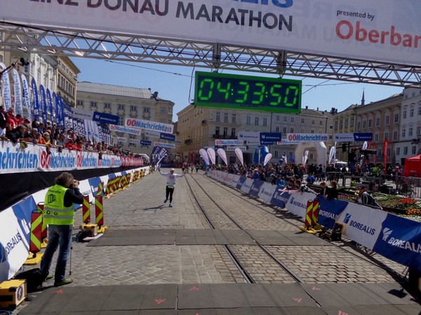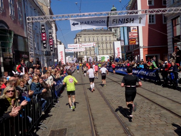 Km41 und rechts in die Zielgerade, nun auch für die Marathonis. Viele Zuseher sind nicht mehr da. Die, die da sind, meinen es aber gut mit mir und applaudieren. Das Ziel ist nahe, Taubenmarkt, durch die Schmidtorgasse, endlich der Hauptplatz. Mein Fanklub jubelt mir von der Tribüne aus zu, das ist mir heute einen kleinen Umweg wert. Ein Foto, dann laufe ich zum 13. Mal in Linz über die Ziellinie, zum 7. Mal nach einem Marathon.