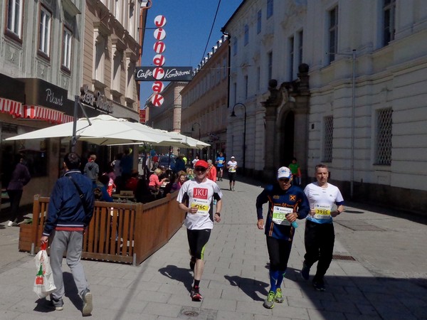 Nach 2h04:57 löse ich beim Halbmarathon in der Herrenstraße die Zwischenzeit aus. Das ist schnell genug, um vom späteren Sieger nicht überrundet zu werden. Vorbei an der Konditorei Jindrak, hier haben unsere fränkischen Gäste gestern die Original Linzer Torte verkostet und für gut befunden. Rechts nun der neugotischen Mariendom, mit einem Fassungsvermögen von 20.000 Menschen ist der Dom die größte Kirche Österreichs. Alle angemeldeten Läufer - 19.535 an der Zahl – würden darin Platz finden.