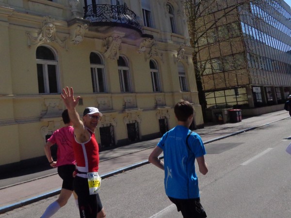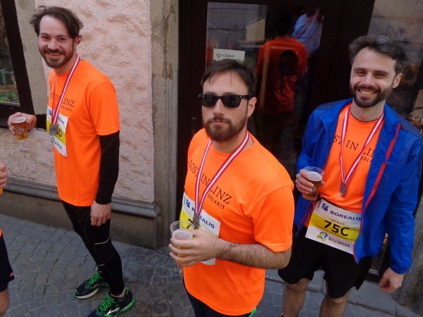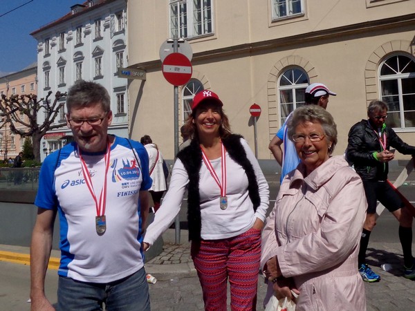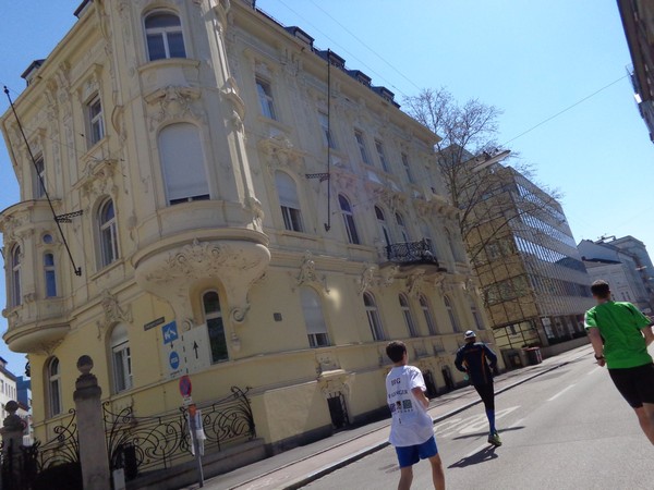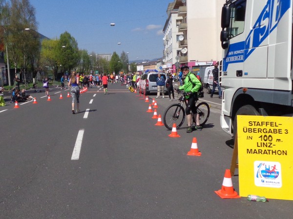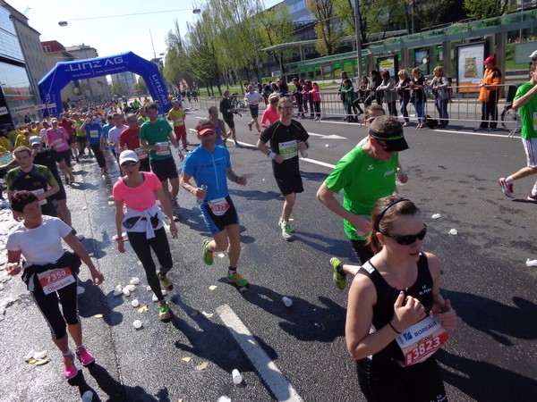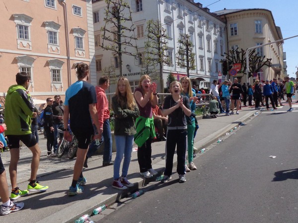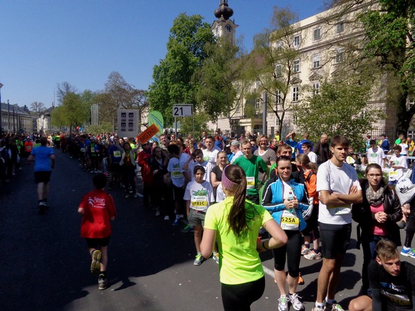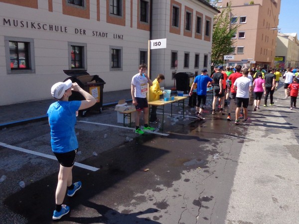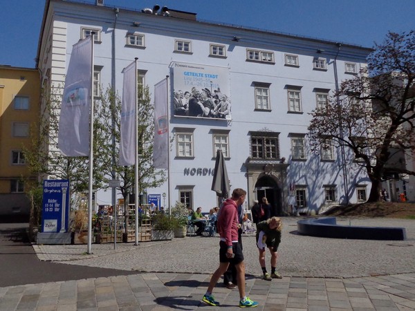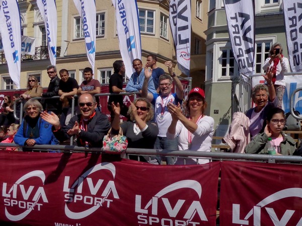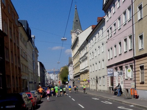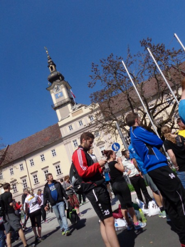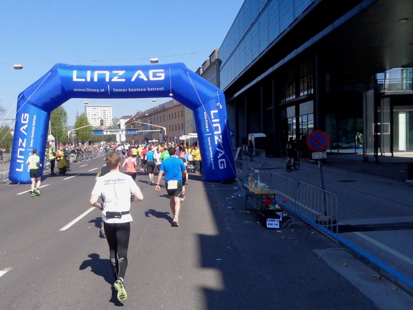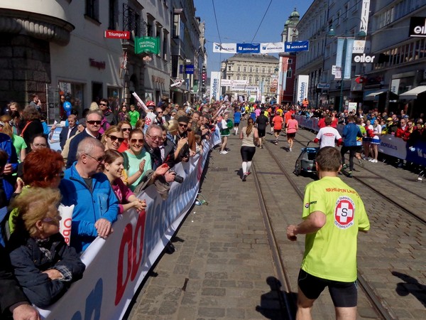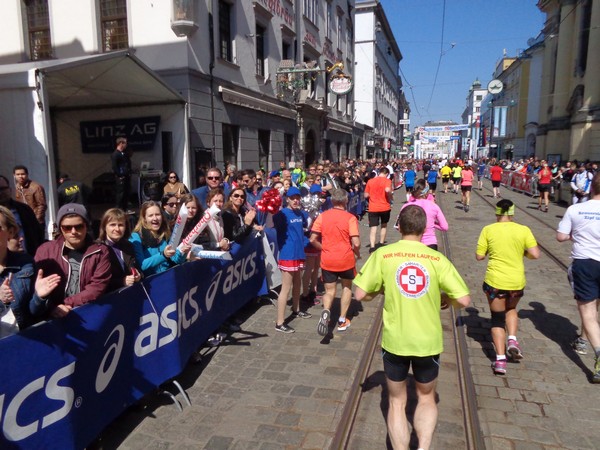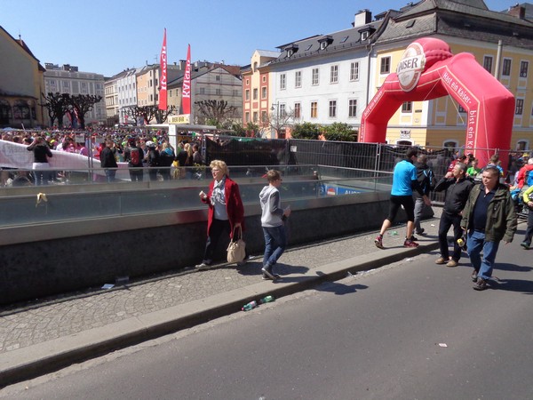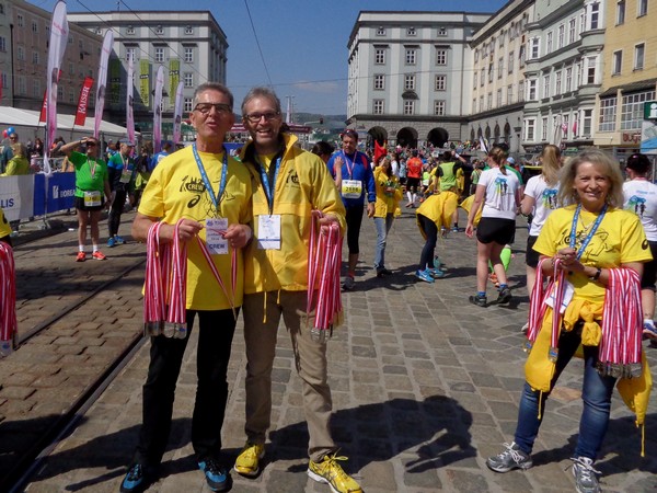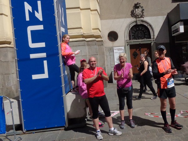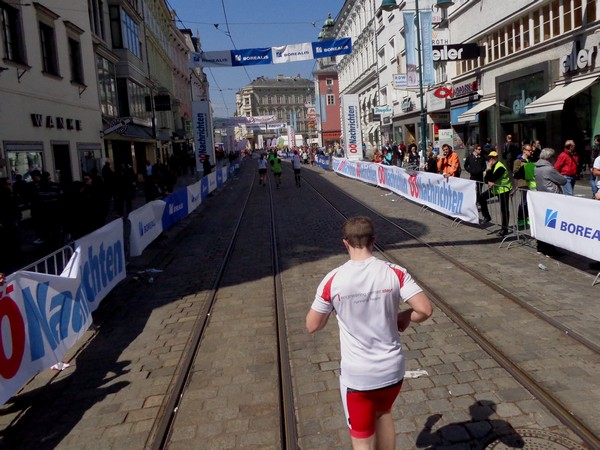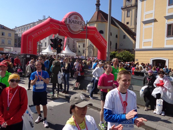 Das Ziel saugt mich an. Bevor ich dem Sog nachgebe, deutet mir ein Herr in gelb links abzubiegen. Ich laufe direkt in die zweite Staffelwechselzone, Karl steht da und wartet auf seinen Sohn. Im nahen Landhaus, einem ehemaligen Minoritenkloster, ist Sitz der oberösterreichischen Landesregierung. Das Kloster wurde 1785 von Kaiser Joseph II. (erstgeborener Sohn von Maria Theresia) aufgehoben.