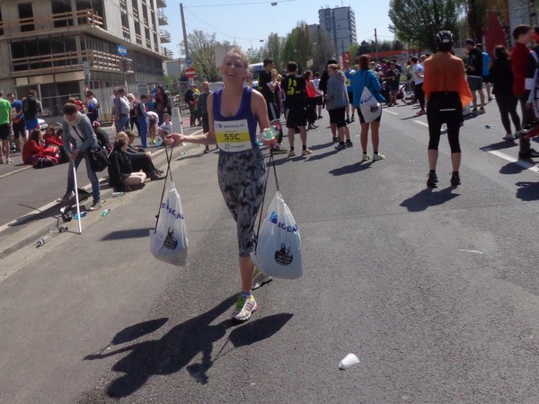 Ich kann mir aussuchen, wer mir die Finisher-Medaille überreicht, denn die vielen Medaillenüberreicher haben gerade nicht so arg viel zu tun. Für die Marathonis ist die Medaille aus Gold, die anderen haben sie in silber erhalten.