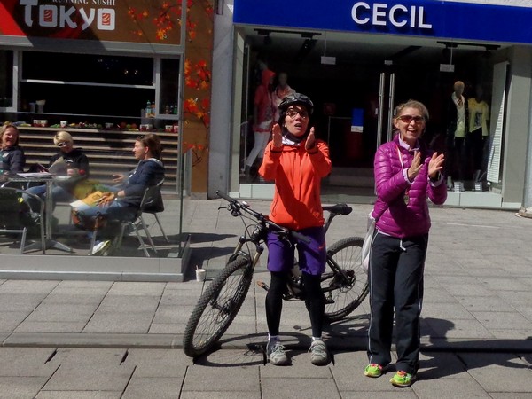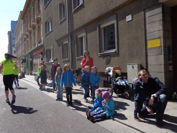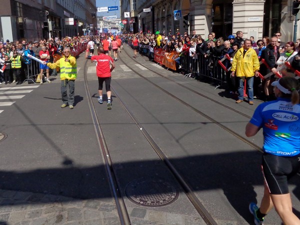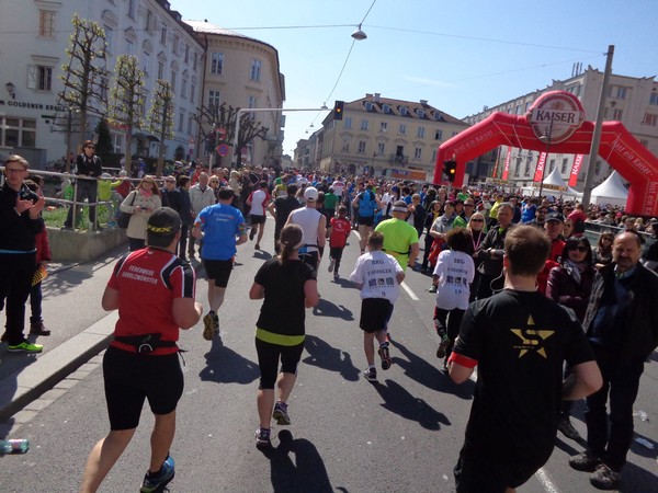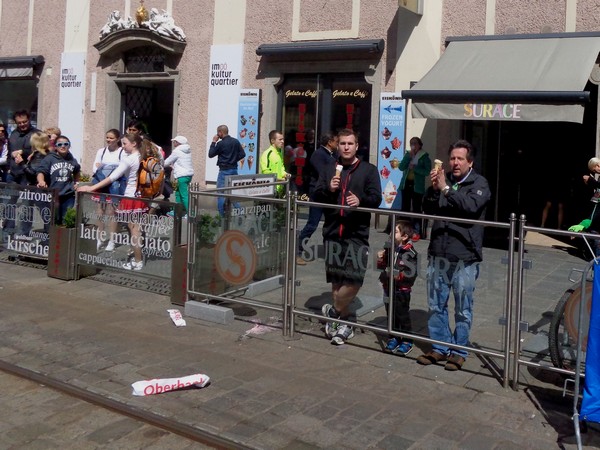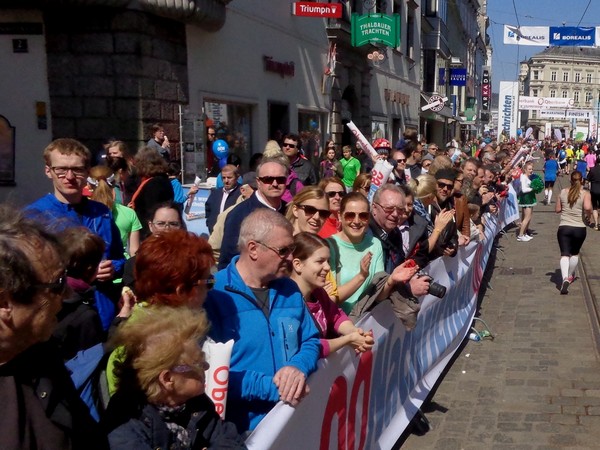 Dann geht’s leicht bergauf in den Graben, vorbei am Pfarrplatz. Medaillendekorierte Viertelmarathonis applaudieren, die schnelleren Halbmarathonis sind schon in der Ziellabe, 1h50 sind seit dem Start vergangen.