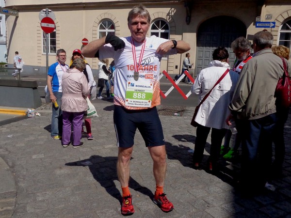 Am Ausgang der Ziellabe vorbei schöpfe ich etwas Applaus ab, Sonja und Jürgen sind nach ihren Halbmarathons längst geduscht und stadtfein. Wir sehen uns später. Ich komme abermals beim eingangs erwähnten Museum „Nordico“ vorbei. Jetzt geht es ganz leicht bergab. Erstaunlich, wie feinfühlig man werden kann. Rechts in die Goethestraße, da treffe ich auf Heinrich, einer jener zehn, die alle bisherigen 14 Linz-Marathons gelaufen sind.