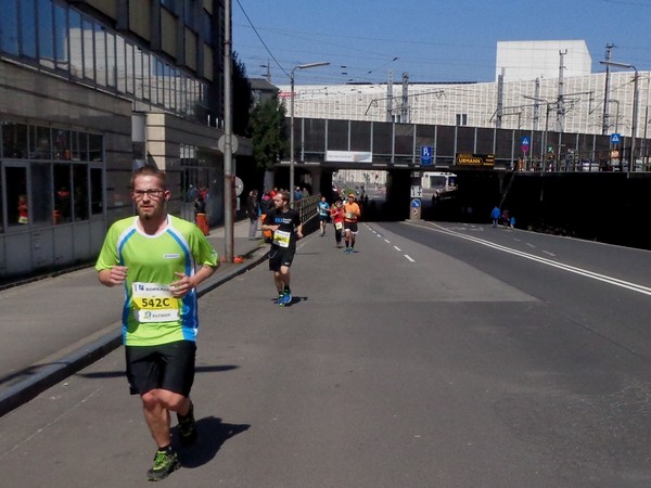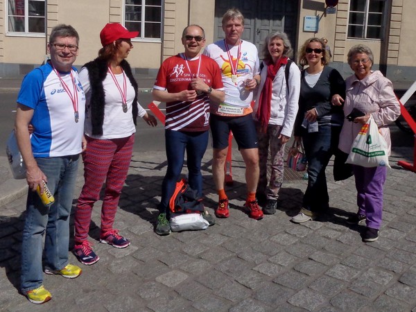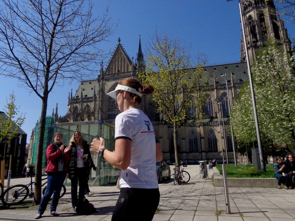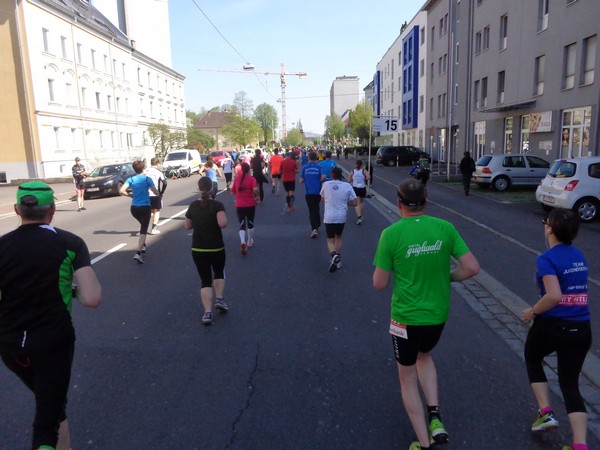 Km19, dann Hessenplatz, vor dem Park-Inn wieder Live-Musik, die Humboldtstraße runter. Rechts in die Goethestraße, 300m, rechts in die Landstraße und ich bin auf der Zielgeraden, die aber nicht ganz gerade verläuft. Noch 1.000m, die letzten paar 100m laufen wir zwischen Straßenbahnschienen auf Kopfsteinpflaster.