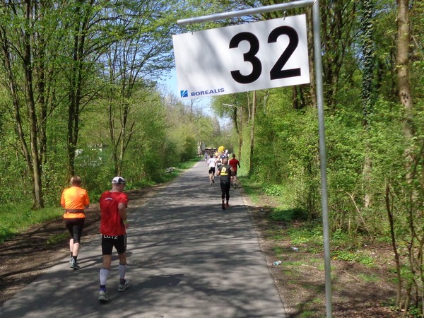Das km26 Schild dann wieder auf der Wiener Straße, Stärkung noch vor km27 beim ÖAMTC. Weiter durch den Wasserwald. Wir Läufer sind unter uns, Zuseher so gut wie gar keine. Bei km30 ein paar Schrebergartler. Sie warten wohl auf Pumuckl, den habe ich hier schön öfters einen Zwischenstopp einlegen sehen. Vogelgezwitscher ist zu hören. Echtes, keines vom iPod!