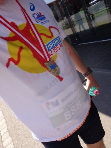 Hinterher bekomme ich noch ein Finisher-Shirt in King-Size, heuer mit neuem Design. Einen Schluck Bier vertrage ich jetzt auch. Bei herrlichem Sonnenschein radeln wir nach Hause. Dort befindet sich meine Ziellabe, die Evi und ich gemeinsam mit den erfolgreichen Halbmarathonis aus dem Frankenland genießen.