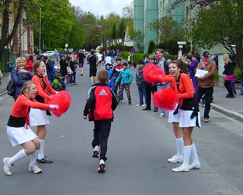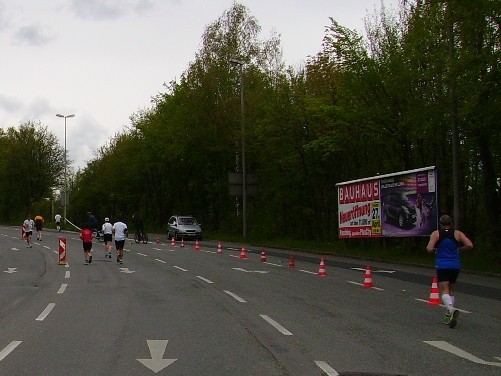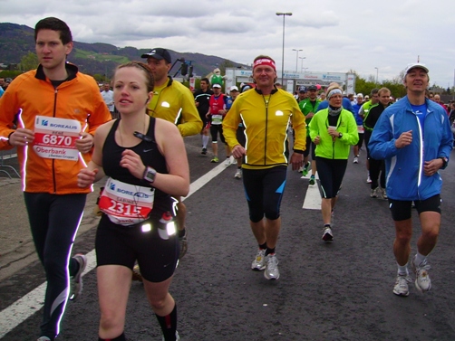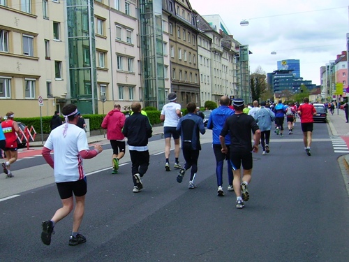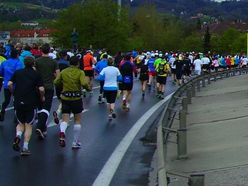 Nach zweieinhalb km verlassen wir die Autobahn und laufen nun stadteinwärts. Ab hier gibt es sehr viel Publikum. In dieser Gegend wohne ich, ich sehe viel bekannte Gesichter. Hier spüre ich den Wind zum ersten Mal unangenehm, trotzdem, meine Haube wird mir zu warm. Da steht mein Fan, Evi, ich reiße mir die Haube vom Kopf. Ein leichter Anstieg über gut 1km folgt – auch hier großes Zuseherinteresse. Es folgt die erste Labe, es gibt Wasser und Iso.