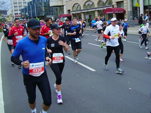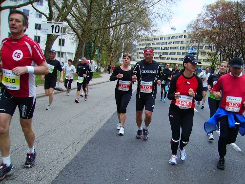 Ich mache zu Beginn reichlich Fotos, muss aber immer darauf achten, dass ich nicht im Weg stehe, lauf also immer an die Seite und bremse nicht plötzlich. Bei km2 überhole ich den 3:45-Pacemaker, in dessen Gruppe Radi, ein Freund von mir läuft. Er will heute erstmals unter 4 Stunden ins Ziel. Es tröpfelt etwas.