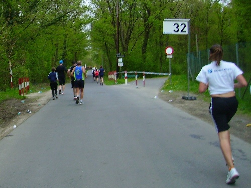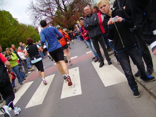 Letzter Staffelwechsel, es dürften einige Schülerstaffeln teilnehmen. Km36, Evi ist da, sie knipst, wir unterhalten uns kurz. Allzu frisch bin ich auch nicht mehr. Der Wind reicht mir schön langsam, nur gut, dass es nicht geregnet hat. Immer öfters kämpft sich die Sonne durch. Vorhin zeigte ein großes Thermometer 15 Grad. Weiter, viel ist nicht mehr los. Gut, dass die Staffelläufer dabei sind. Zwar wird man, vor allem nach den Staffelwechseln, immer wieder überholt, aber die 500 Staffeln beleben vor allem den zweiten Halbmarathon doch sehr. Als ich bei km39 fotografiere, kommt der 4:15-Schrittmacher mit vier Begleitern vorbei. Da will ich jetzt dranbleiben. Vorbei am Museum Francisco-Carolinum, einem alten Palais, ist es nicht mehr weit.