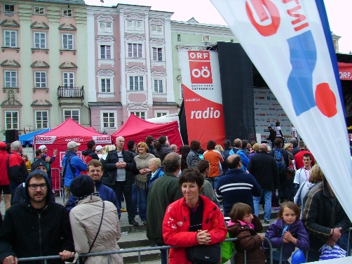 10.35 Uhr Km16, stelle ich fest. Jetzt wird der Wind wieder heftiger, je nach Straßenverlauf. Es sind relativ viele Haken in der Strecke, der Wind bläst aber fast in allen Abschnitten, und er wird stärker. Mit 3-lagig am Oberkörper bin ich zufrieden Nur leider rutscht die lange Hose mehr als mir lieb sein kann. Km17, mein Power Gel ist fällig. Ah und hier wieder ein Musikkapelle. Bei km18 gibt es klassische Musik in der Powerzone, die soll auf das Brucknerfest im September hinweisen. Anton Bruckner war Komponist und Domorganist im Alten Dom (=Ignatiuskirche, 17. Jhdt), barock, zu Linz. Er stammt aus Ansfelden, einem Vorort im Süden von Linz.