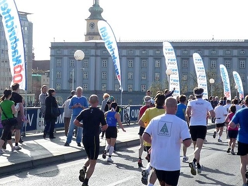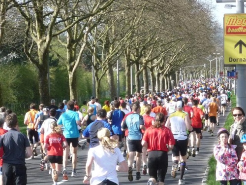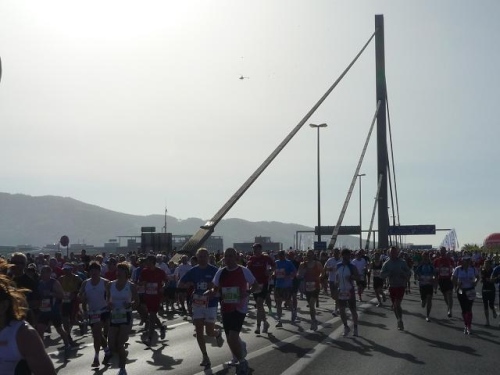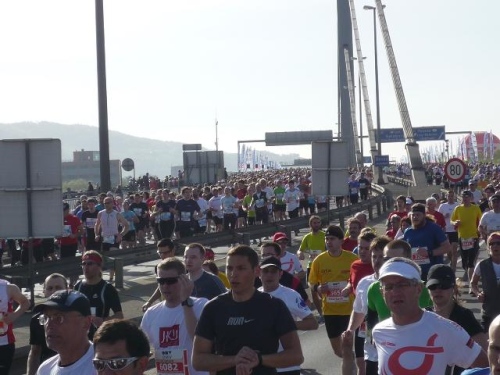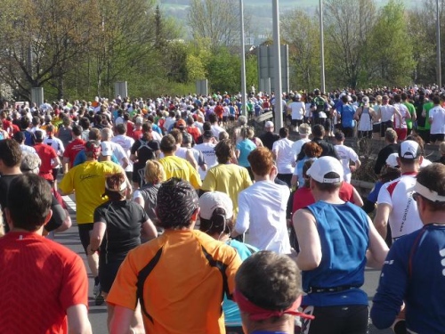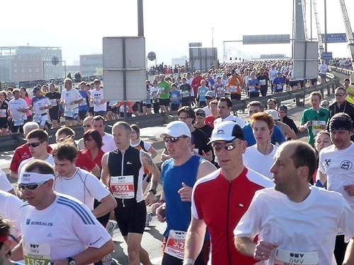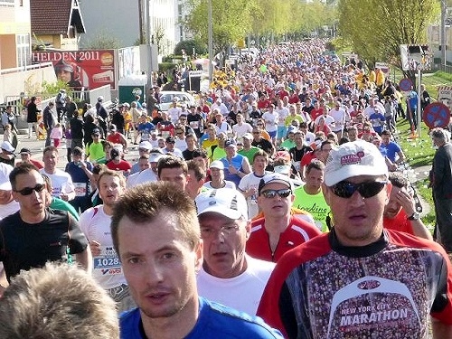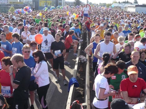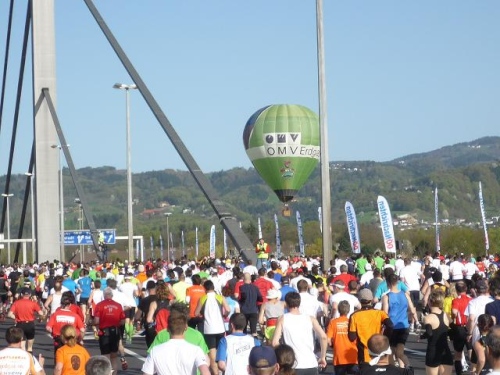 Ein ganz besonderes “Warm up”-Special hält der Veranstalter für die Läufer bereit. Angeleitet von erhöht auf kleinen Plattformen stehenden Vortänzern sollen die Läufer zu Michael Jacksons “Beat it” zu einem Flash Mob, also zum massenhaften, bewegungsidentischen Mittanzen animiert werden. Eine nette Idee - nur entpuppt sich der Flash Mob eher als Flash Flop. Den Läufern ist offensichtlich nicht nach Mitmachen zumute. Nichtsdestotrotz: Die Stimmung ist bestens. Hubschrauber kreisen über uns und fangen die Szenerie aus der Vogelperspektive für die Medien ein. Die Top-Athleten werden vorgestellt, allen voran der “local hero” Martin Pröll. Die österreichische Nationalhymne ertönt, die letzten zehn Sekunden werden kollektiv herunter gezählt, Hunderte Ballons steigen in den Himmel. Dann der erlösende Böllerschuss. Einer Riesenwelle gleich überspülen viele Tausend Läuferbeine den Asphalt der Autobahnbrücke. Nach New York im letzten November empfinde ich den Start in Linz fast wie ein Deja Vu – ein Einstieg in das Marathonabenteuer, den man nicht vergisst