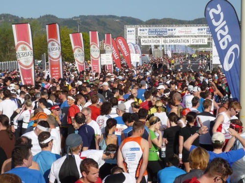 Die Aufstellung erfolgt am südlichen Ende der die Donau querenden Voest-Brücke, und zwar über alle vier Spuren der Autobahn hinweg. Rechts die Viertelmarathonläufer, links der Rest, also die Halb-, Voll- und Staffelmarathonläufer. Benannt ist die 410 m lange Donaubrücke, deren Fahrbahnen über Stahlseile von einem einzigen gigantischen, 70 Meter in die Höhe ragenden Pylonen gehalten wird, nach dem Linzer Stahlkonzern Voestalpine.