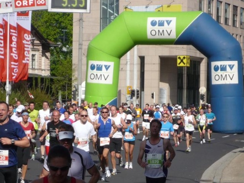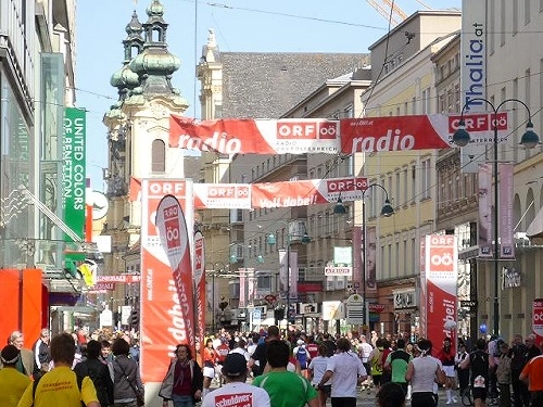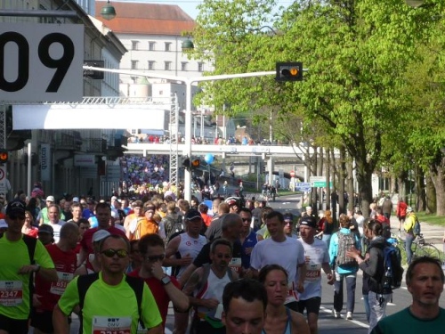 Geradeaus ginge es von hier direkt in die Altstadt hinein. Doch der weitere Zugang ist uns (zunächst noch) verwehrt und wir werden nach links auf die Untere Donaulände abgeleitet, die die Altstadt und die Parkanlagen entlang der Donau trennt. Auch hier: Menschen über Menschen, links, recht, über der Straße. Ich bin tief beeindruckt. Große Banner weisen die Läufer darauf hin, dass sich der bislang gemeinsame Kurs teilt. Streckenhelfer versuchen diejenigen, die es trotzdem nicht schaffen, sich richtig einzuordnen, auf den rechten Weg zu bringen. Denn für die Viertelmarathon-Läufer ist nach einer finalen kleinen Schleife durch die Altstadt nun der Endspurt zum Ziel auf dem nahen Hauptplatz angesagt.