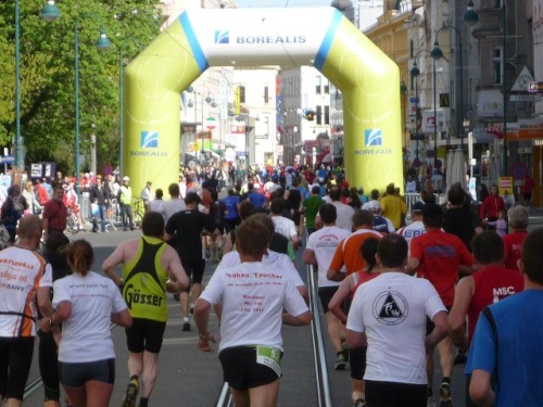 Ganz plötzlich ist er da: der Abzweig nach links. Noch einmal säumen dichte Menschentrauben den Kurs, der nächste Staffelläuferwechsel steht an. Dann wird es schlagartig ruhig, fast schon einsam: auf und an der Strecke. Nur das Trappeln der Schuhe auf dem Pflaster der Herrengasse, auf der wir die Altstadt queren, erfüllt die Luft. Der nun sehr viel dünnere Läuferstrom macht deutlich, dass hier eben drei mal so viele Läufer die Halb- der Volldistanz vorziehen. Es ist zunächst schon ein etwas seltsames Gefühl, das einen da beschleicht, aber ich kenne das schon aus Salzburg, auch aus Freiburg. Aber die neue Situation hat durchaus auch etwas Entspannendes.