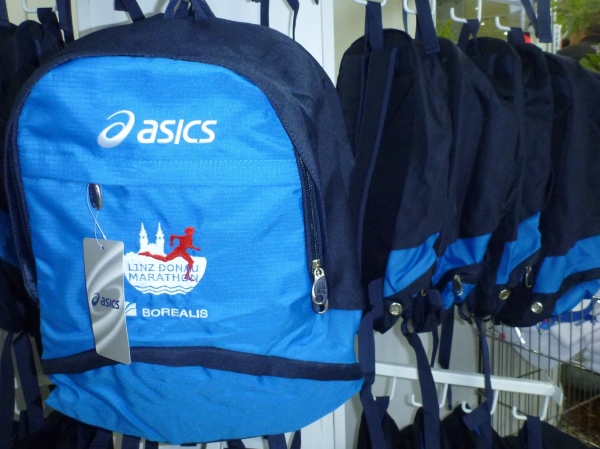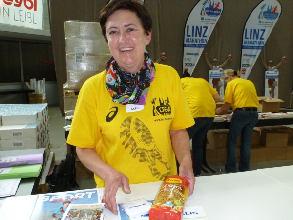 Erster Anlaufpunkt ist die Tips Arena Linz in der Innenstadt. Mein Tipp für alle Teilnehmer: wer es sich einrichten kann, soll die Unterlagen schon am Freitag abholen, denn am Samstag während der Schülerläufe werden die Parkplätze knapp. Im hinteren Teil der Arena werden die Startnummern ausgegeben und man erhält das Startsackerl, in dem Nudeln, Getränke und Riegel nebst einiger Werbung zu finden sind. Sehr großzügig ist die Ausgabe aufgebaut, denn du musst keine Minute warten und wirst sofort zuvorkommend von den freundlichen Helfern bedient.