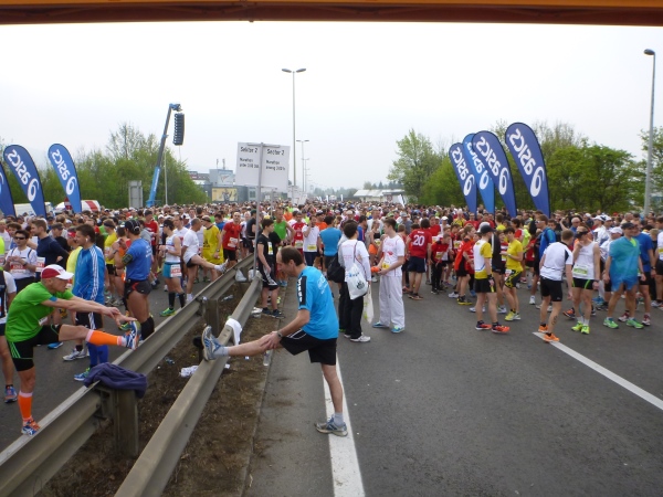 Auf der Autobahnbrücke, die Marathon- und Staffelläufer laufen links, für die Halbmarathonis ist die rechte Fahrbahn vorgesehen, herrscht schon tolle Stimmung: Musik, Informationen, Interviews. Die Zeit vergeht in Nu. Ich werde noch Zeuge, wie ein Schütze seinen Böllerstutzen schussfertig macht. Da wird der Fotograf neugierig und erkundigt sich, wo denn der Schütze beim Start stehen wird.