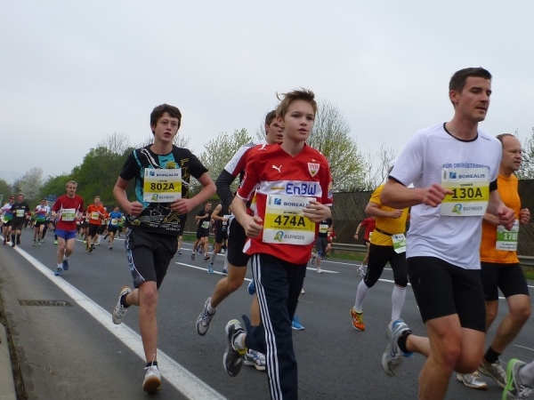 Kilometer fünf, die erste Tränke. Es gibt alles, Wasser, Isogetränke, später Cola, Riegel, Gel, Bananen. Super die Betreuer an den Tankstellen, die reichen alles zu. Wer sich Wasser mitnehmen will, schnappt sich eine 0,5-Liter-Flasche.