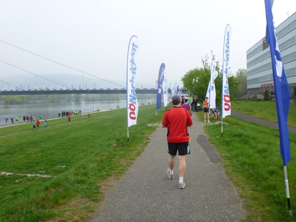Ich gebe meine Kleidung im Anton-Bruckner-Haus ab und mache mich auf den Weg entlang der Donau zur VÖEST-Brücke. Und da läuft mir jemand bekanntes über den Weg: Renate Werz. Die freundliche Schwarzwälderin hat einen Österreichurlaub gebucht, läuft heute in Linz und nächste Woche in Wien. Jetzt hofft sie, dass sie innerhalb des Zeitlimits von sechs Stunden bleibt.