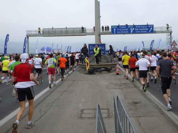 Für den Start der Läufer hat man hier kurzerhand die A7, die Mühlkreisautobahn, gesperrt. Nach dem Überqueren der Donau verlassen wir die A7 am Exit 15 Linz-Dornach fast als Geisterfahrer, ääh -läufer, denn wir laufen auf der verkehrten Seite. Zwei Kilometer auf der Autobahn, eine verrückte Sache.
