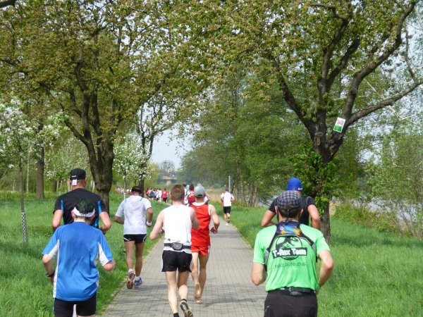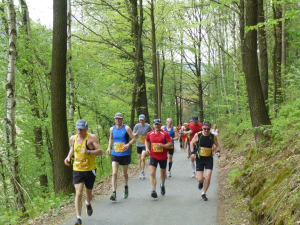 An der Bastei vorbei verliert sich unsere Laufstrecke wieder im dichten Laufwald. Es folgt die profilierteste Passage unsere Kurses. In einer Bandbreite von etwa 30 Höhenmetern bewegen sich die An- und Abstiege. Aber im schattigen, vom lichten Grün der jungen Blätter erfüllten Wald fällt das nicht allzu schwer.