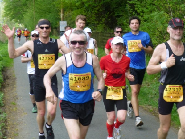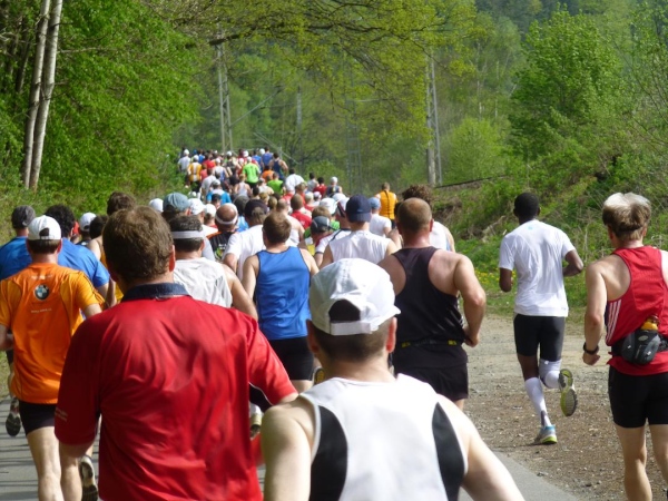 Etwa ab km 4 lockern Wiesen das dichte Waldgelände auf und eröffnen uns damit wieder eine größere Perspektive auf die umgebende Bergland. Bei km 5 muss der gesamte Marathontross erneut die Bahngleise queren, dieses Mal oberirdisch. Aber Dank eines Arrangements des Veranstalters mit der Bahn müssen die Läufer nicht damit rechnen, vor geschlossenen Schranken zu stehen.
