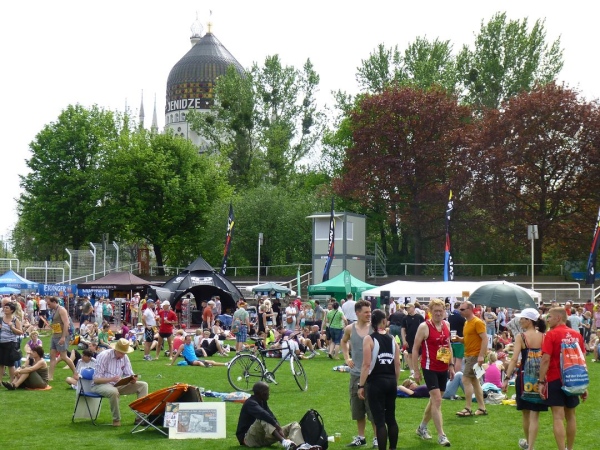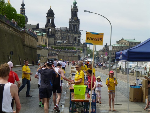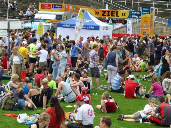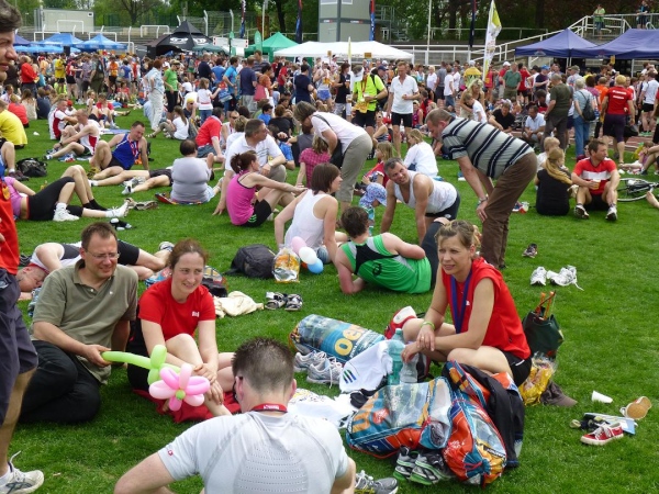 Ich ziehe weiter die herrlichen Wiese vor und beobachte den Trubel aus der Bodenperspektive. So unter freiem Himmel liegend und ohne den am Fluss wehenden Wind zu spüren wird mir einmal mehr bewusst, wie intensiv die Sonne heute herunter brennt. 31 Grad im Schatten, Rekordtemperatur für April, wird mir später die Anzeige meines Autos verkünden. Da ist es auch kein Wunder, dass es von etwa 1.250 gemeldeten Marathon-Teilnehmern in diesem Jahr nur 990 in die Finisherliste schaffen, nachdem es in den Vorjahren stets knapp über 1.000 waren. Und auch den Siegerzeiten merkt man an, dass die Hitze ihren Tribut forderte. Bei den Männern kommt der Erstplatzierte, wie schon in den letzten 12 Jahren und damit quasi traditionell, aus Polen: Bartosz Mazerski siegt in 2:31:08 Std.. Die Gewinnerin der Damenkonkurrenz, Patricia Kusatz, ist gar 3:20:19 Std. unterwegs.