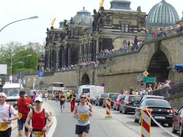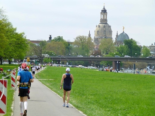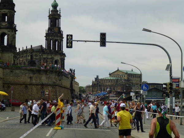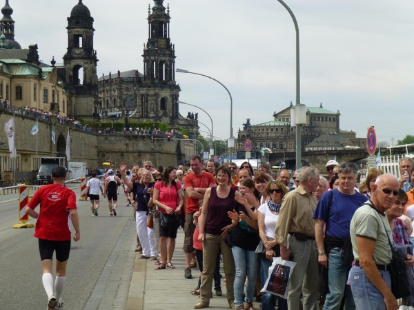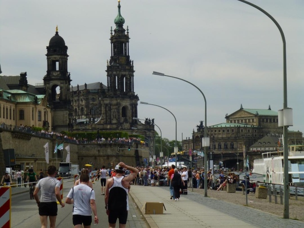 Für mich bedeutet die Kuppel heute vor allem eines: Sie ist erlösender Vorbote des nahen Ziels. Langsam, aber stetig rückt die Skyline der historischen Altstadt näher. Unter der Carolabrücke hindurch betreten wir deren Kernbereich. Vom Weg über die Elbwiesen wechseln wir auf das Terrassenufer, wie die auf Höhe des Elbufers entlang führende Straße genannt wird. Zu unserer Linken sehen wir oberhalb der viele Meter senkrecht aufsteigenden, festungsartigen Ufermauer die Brühlsche Terasse, quasi der „Balkon“ der Altstadt, allerdings ein Balkon von zyklopischen Ausmaßen: einen halben Kilometer lang und bis zu 200 Meter breit. Sie ist eine der beliebtesten Flaniermeilen der Stadt und der Ausblick über die Elbe ist traumhaft. Ob die vielen Zuschauer dort oben wegen uns oder - wahrscheinlicher - einfach wegen des sommerlichen Wetters da sind, vermag ich nicht zu beurteilen. Tatsache ist: Sie empfangen uns mit großem Hallo. Hinter der Terrasse türmt sich die monumentale Hochschule für bildende Künste auf, gekrönt von der “weltgrößten Zitronenpresse”, wie deren auffällige Kuppel aus Stahl und Glas von Spöttern genannt wird.
