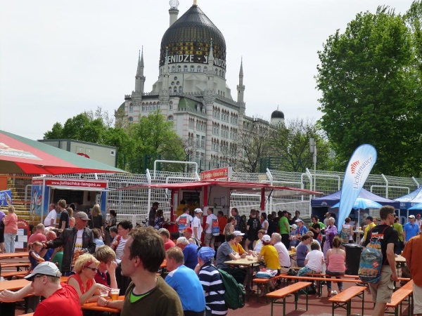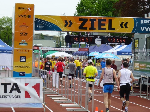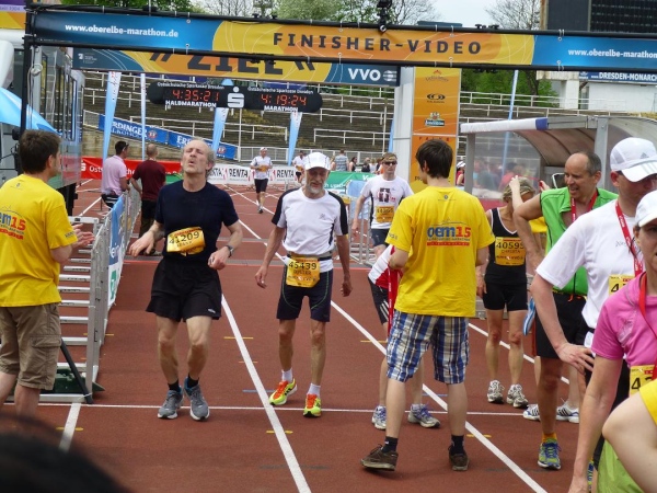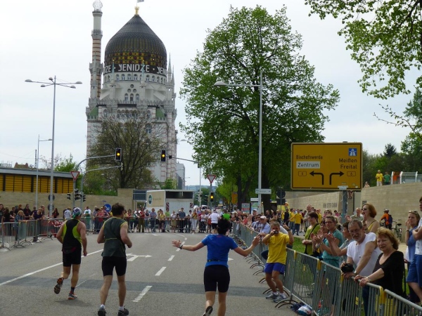 Zu Füßen von Yenidze liegt fast schon unauffällig unser Ziel: Das Heinz-Steyer-Stadion. Die aus dem Jahre 1919 datierende, aber äußerlich sanierte Mehrzwecksportanlage hat ihre großen Zeiten zwar schon lange hinter sich. Doch als Marathonziel ist sie großartig. Auf den letzten 200 m umrunden wir auf der Tartanbahn die zentrale Rasenfläche, die bevölkert ist von Hunderten erschöpft im Gras liegenden Läufern. Noch während dieser Runde freue ich mich schon darauf, mich dazu zu gesellen. Und keine zwei Minuten später ist es soweit.