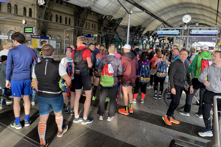 Dann eine Ansage: der Start wird heute um 5 Minuten verschoben, denn gerade erst ist der letzte Zug mit Teilnehmern angekommen.