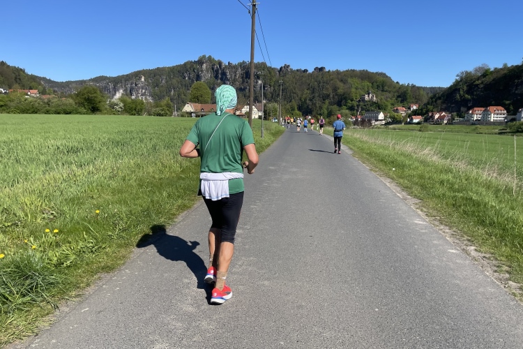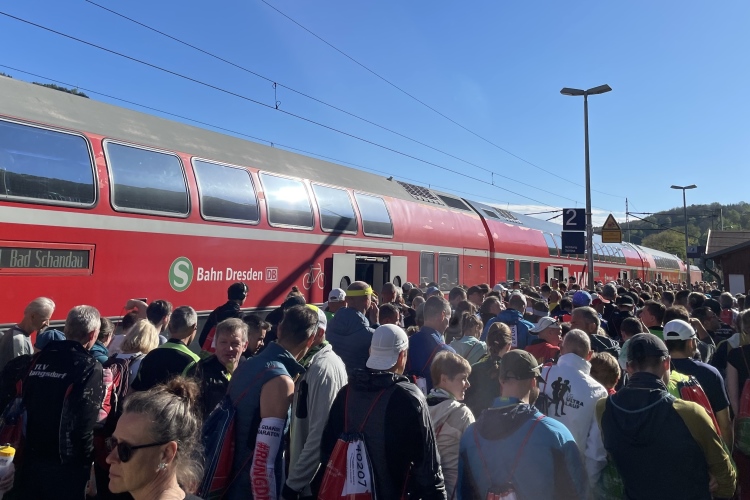 Als wir endlich in Königstein ankommen, dauert es eine ganze Weile, bis der Zug entleert ist, denn der Bahnsteig ist von Läufern überfüllt, alle müssen sich durch eine enge Unterführung quetschen.