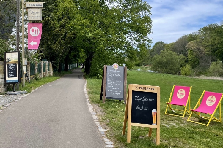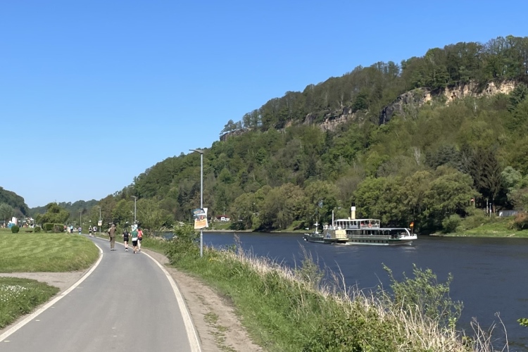 Unter einer wenig vertrauenerweckenden engen Bahnunterführung, die gerade von einem Zug mit alten Tankwagen überquert wird, wechseln wir wieder direkt an die Elbe, ein hölzernes Schild weist uns darauf hin, dass wir bis Pirna noch 6 km vor uns haben. Bald darauf überholt uns der Dampfer „Stadt Wehlen“ und wir nähern uns der nächsten von insgesamt 8 Verpflegungsstellen.