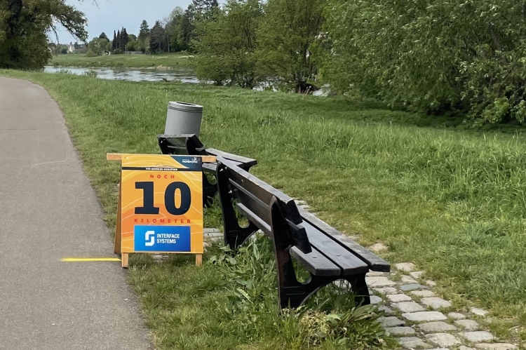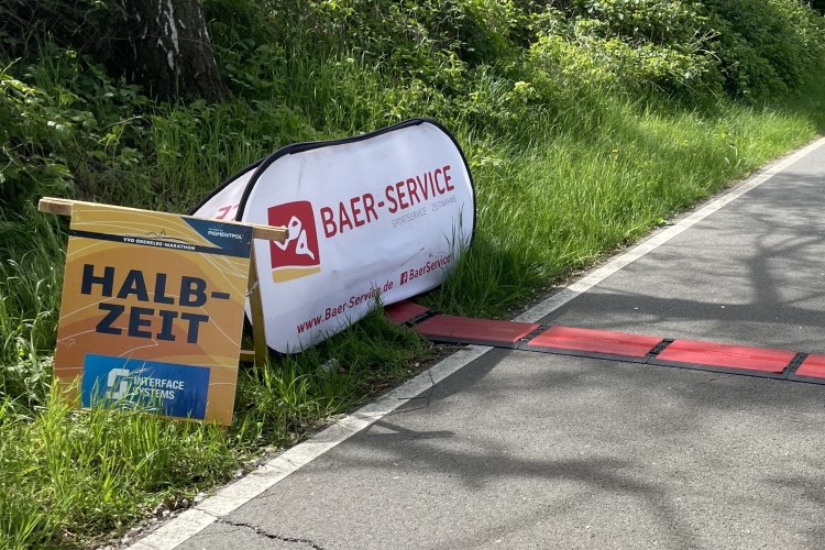 Dann geht es unter der Bahn hindurch und uns erwartet, nein, nicht die erste Verpflegungsstelle, sondern die Gaststätte „Kleine Einkehr“. Ein andermal, sag ich mir, und bleibe tapfer auf der Strecke, obwohl ich schon schwitze. Kurz danach werden wir von einer freundlichen Organisationhelferin mit einem Schild vor einer Baustelle gewarnt.