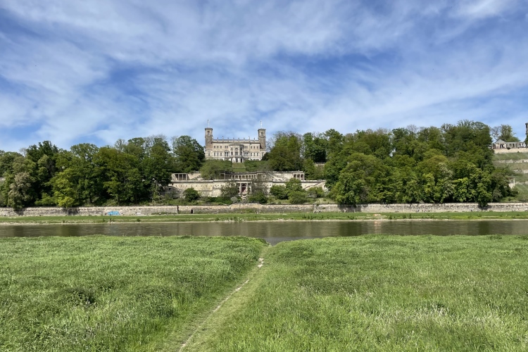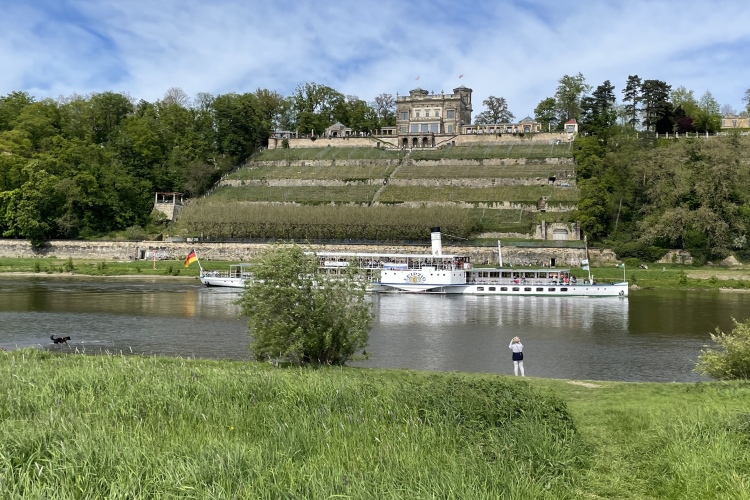 Der Raddampfer „Leipzig“ posiert vor dem mittleren der drei Schlösser, dem Lingnerschloss. Alle drei Schlösser sind erst im 19 Jahrhundert von wohlhabenden Unternehmern gebaut worden, waren also keine historischen Wohnorte von Adelsgeschlechtern. Dann erreichen wir die Waldschlößchenbrücke, deren Bau für die UNESCO der Grund war, der Stadt Dresden den „Welterbe“-Titel zu entziehen. Für mich bleibt Dresden trotzdem einer der schönsten Städte Deutschland, Titel hin oder her.