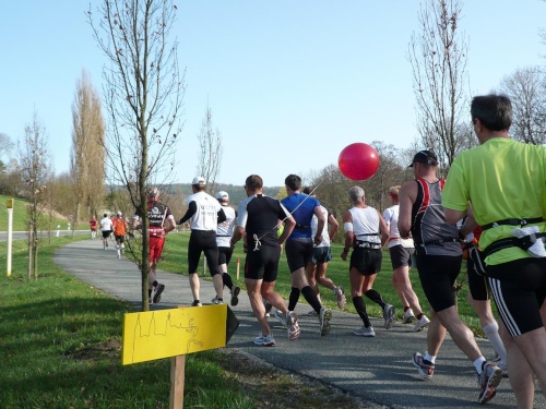 Nach gut zwei Kilometer überqueren wir in Unnersdorf den Main, der erst ab Bamberg schiffbar ist. Im Ort sind einige Zuschauer am Klatschen, aber viele Zuspruch werden wir bei diesem Landschaftslauf nicht erhalten. Das ist auch nicht nötig, denn die ergrünende Natur lenkt uns ab. Blühende Sträucher, austreibende Bäume, Narzissen, Schlüsselblumen sind zu sehen. Feldlerchen und Spechte kann man hören.
